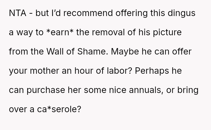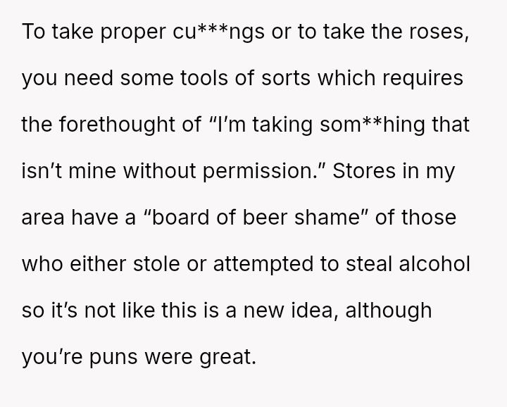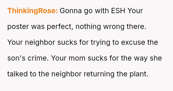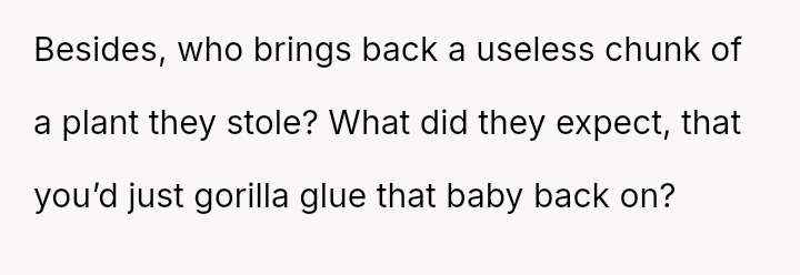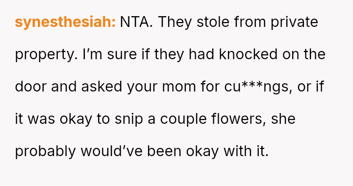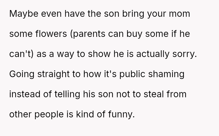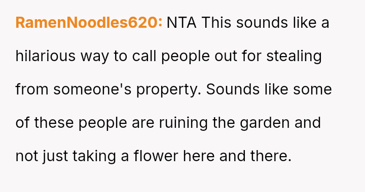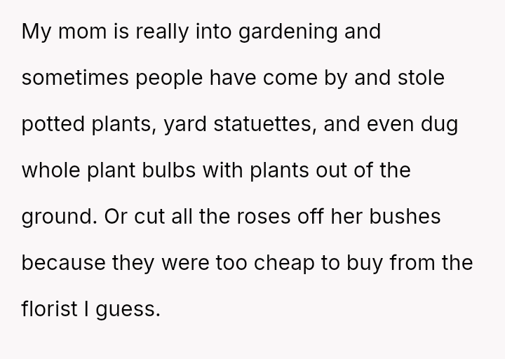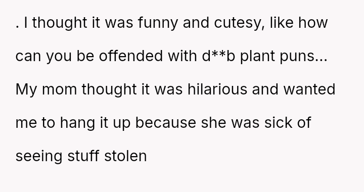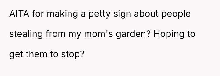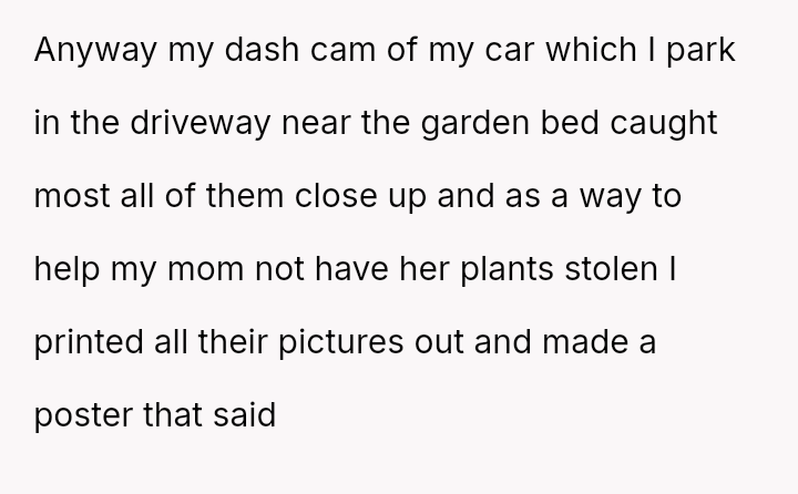 The original poster (OP) acted out of frustration and a desire to protect their mother's garden by creating a public shaming poster featuring photos and humorous, pun-laden accusations against known plant thieves.