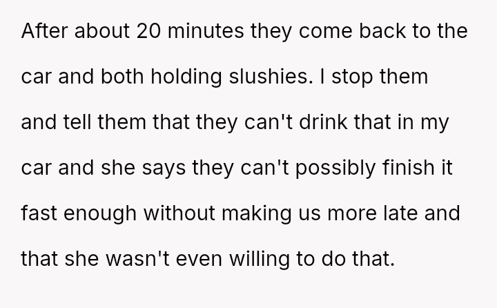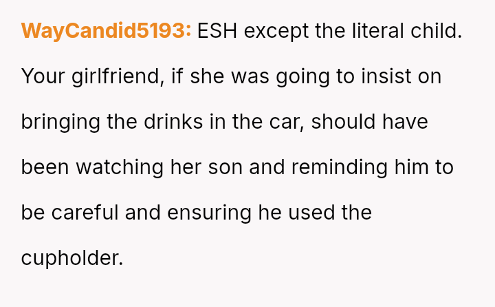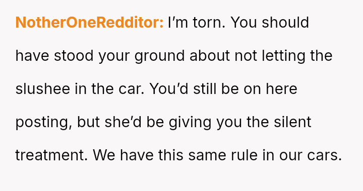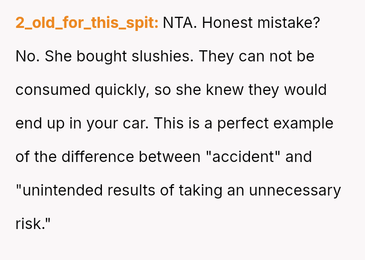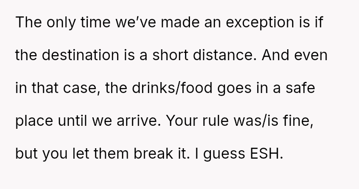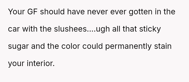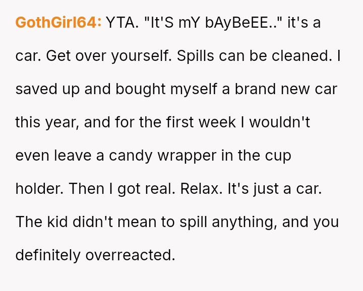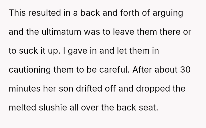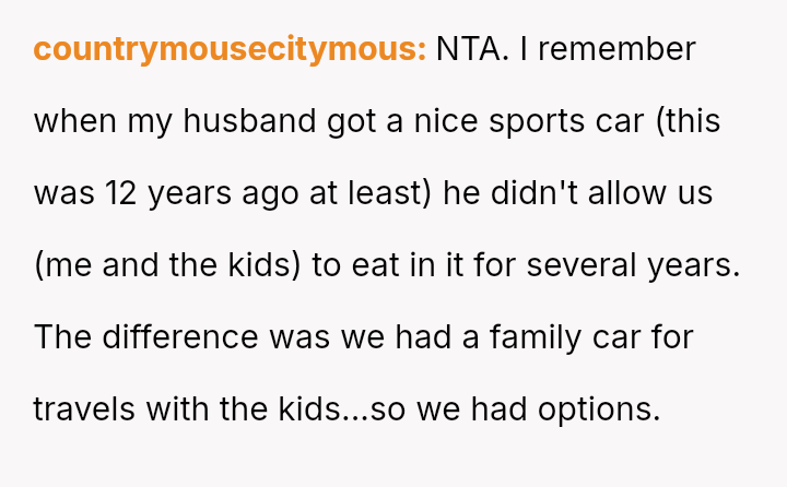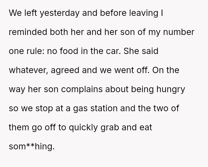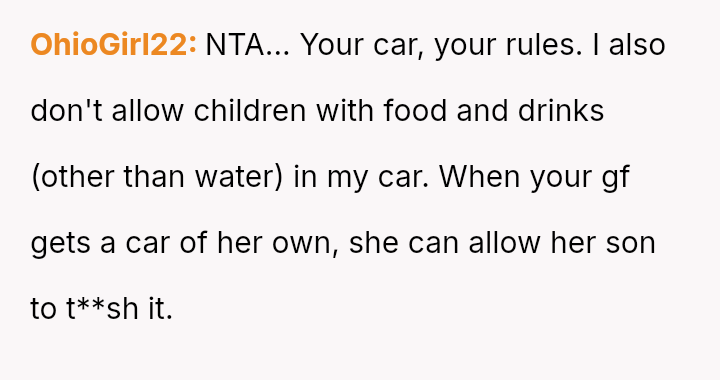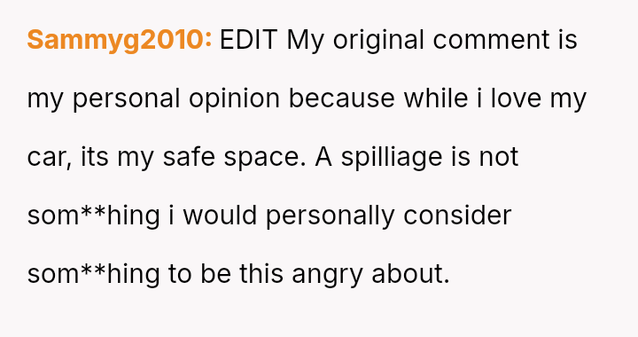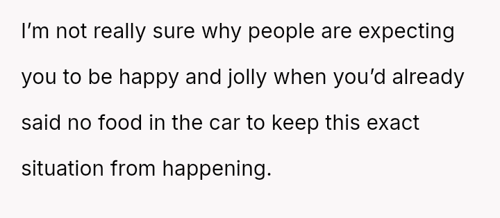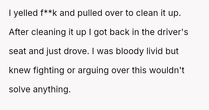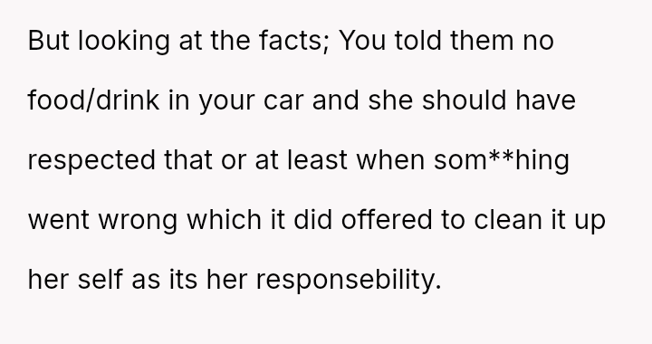 The Original Poster (OP) experienced significant distress and frustration when their clear boundary regarding food and drink in their new car was v***ated, leading to a costly mess.