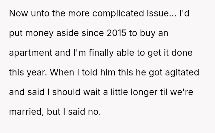 The original poster (OP) feels determined to proceed with purchasing an apartment using her long-term savings, leading to a significant conflict because her boyfriend expects her to either delay the purchase until marriage or add his name to the t*tle now.