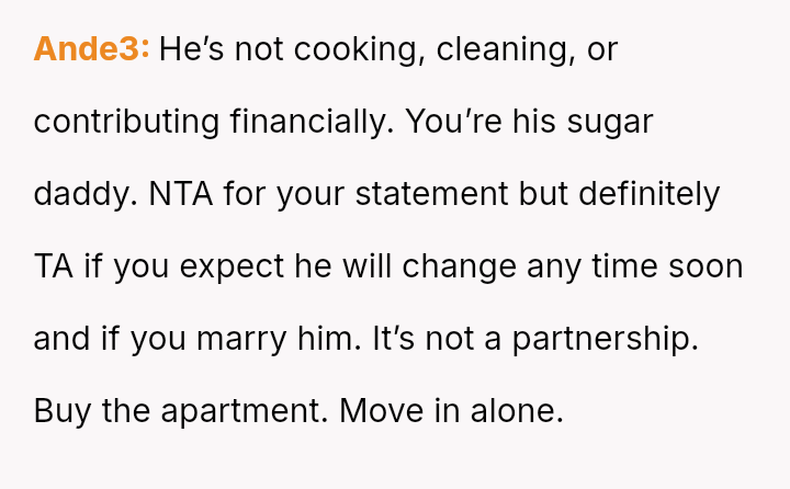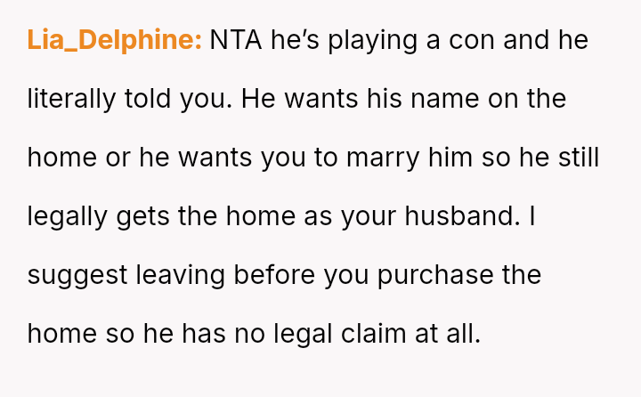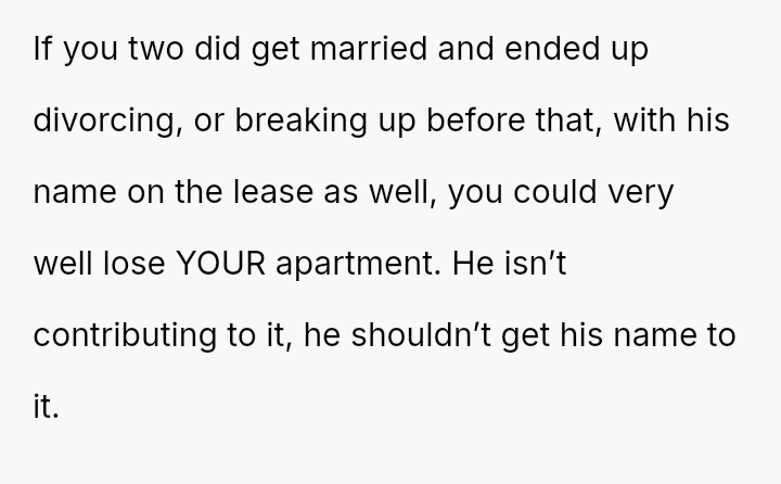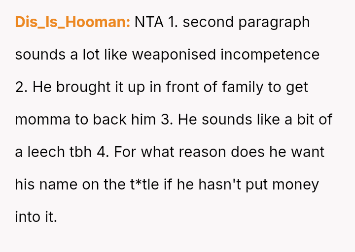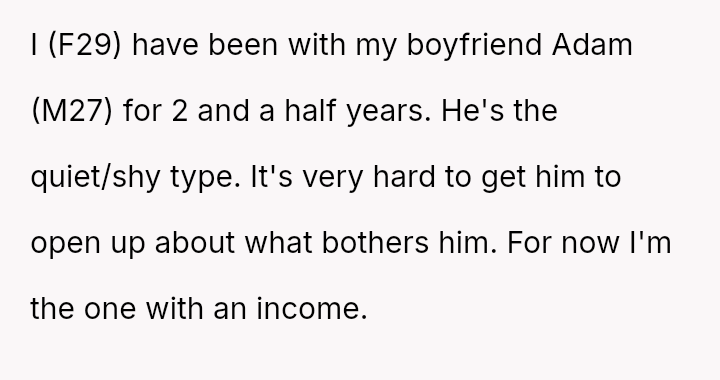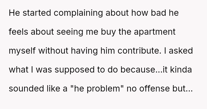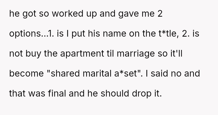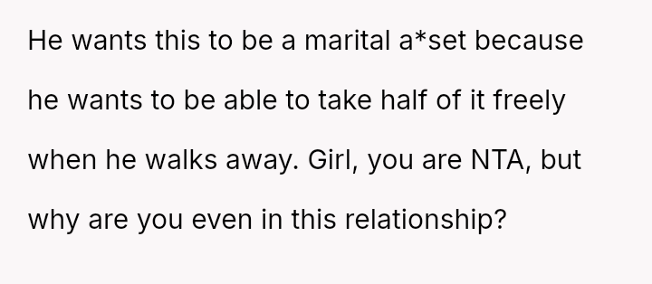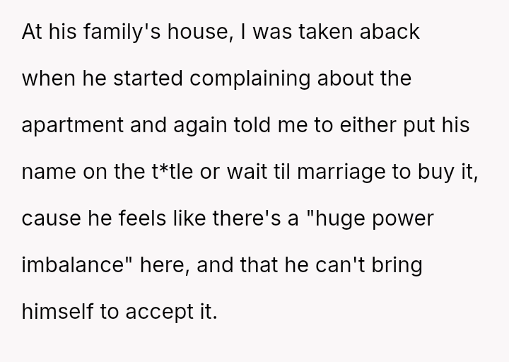 Given the boyfriend's stated feelings of power imbalance versus the OP's right to use her own money for her a*sets, the central question remains: Should financial autonomy and pre-marital a*set protection take precedence, or is the boyfriend's request for shared ownership—driven by feelings of insecurity regarding his lack of financial contribution—a reasonable expectation within their committed, though unmarried, relationship?