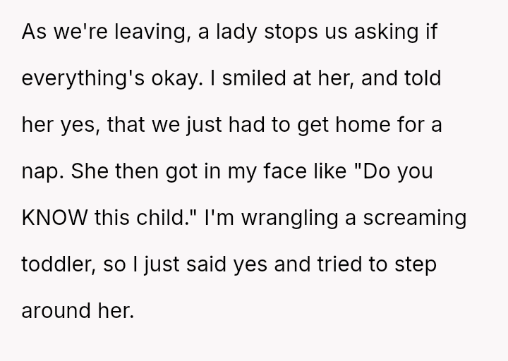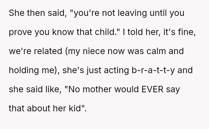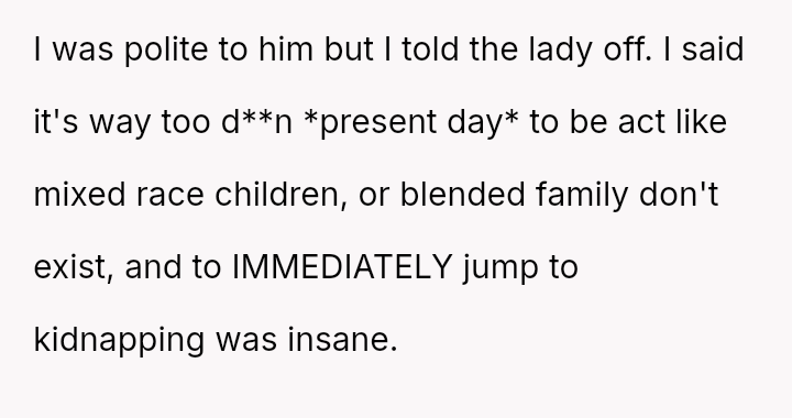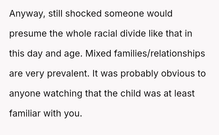 The original poster (OP) faced a deeply upsetting confrontation where an unrelated stranger aggressively questioned their relationship with their white niece, ultimately escalating the situation to security and police based on racial a*sumptions about their mixed-race pairing.