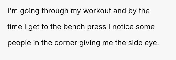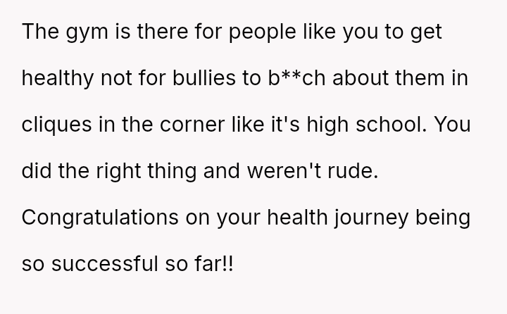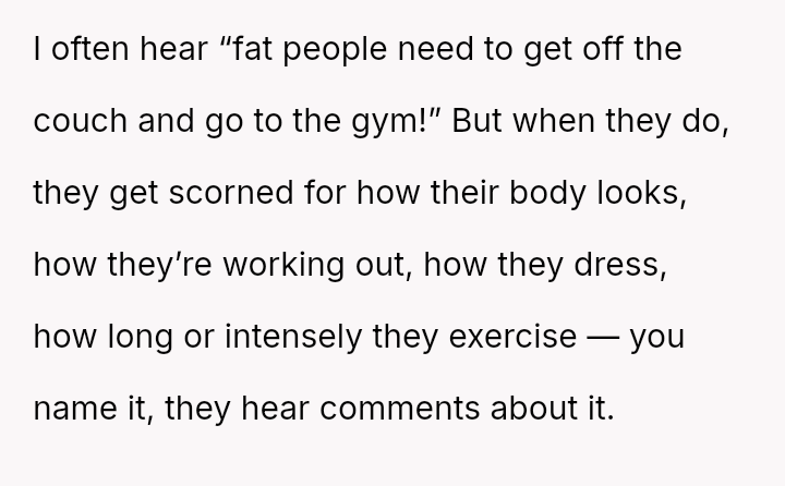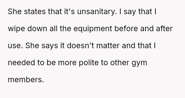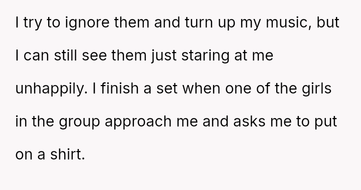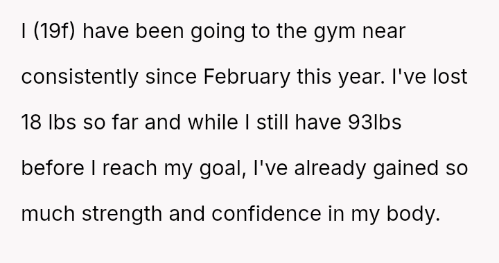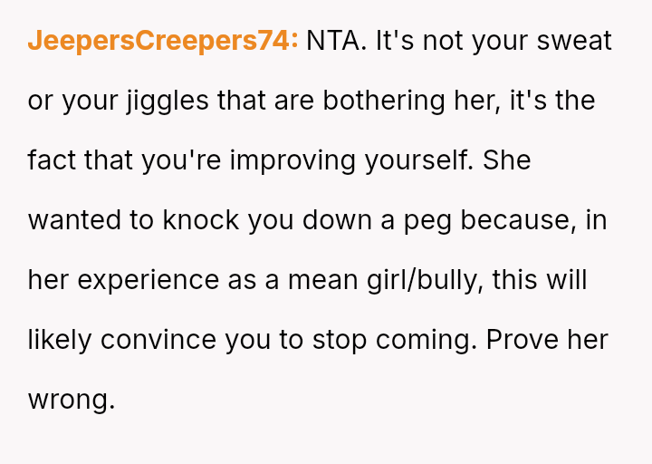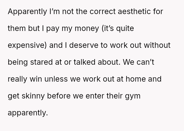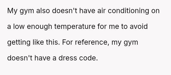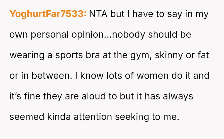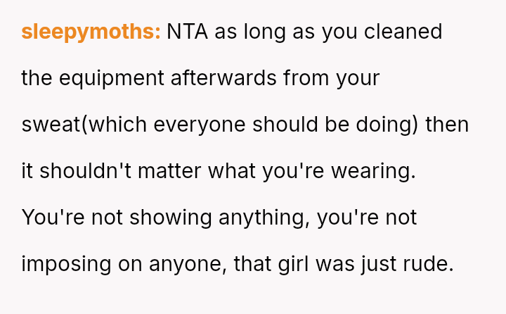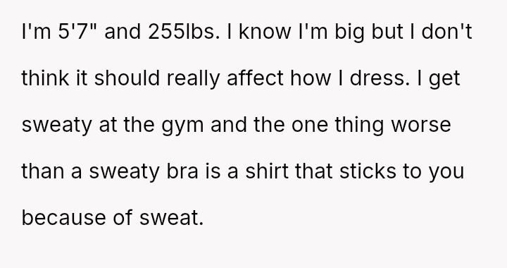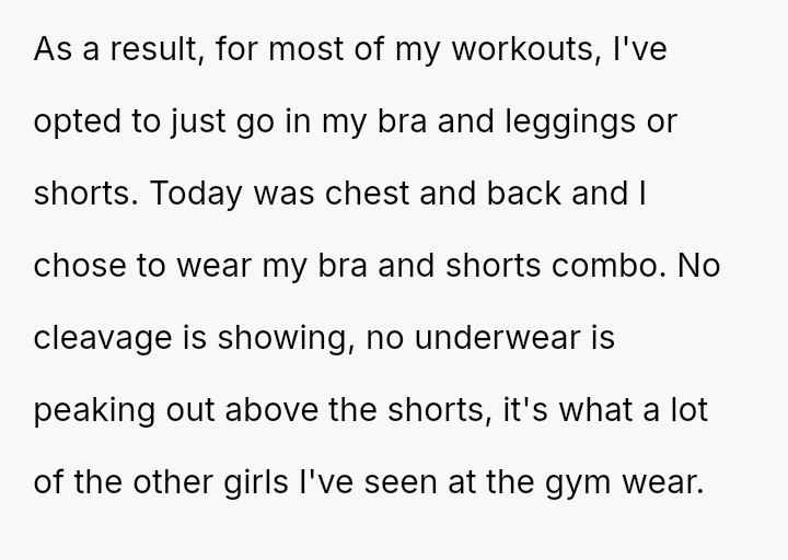 The original poster (OP) is experiencing conflict after being confronted at the gym for wearing a sports bra and shorts due to perceived body image issues from other members, despite their practical need to dress lightly for sweat management and the gym having no dress code.