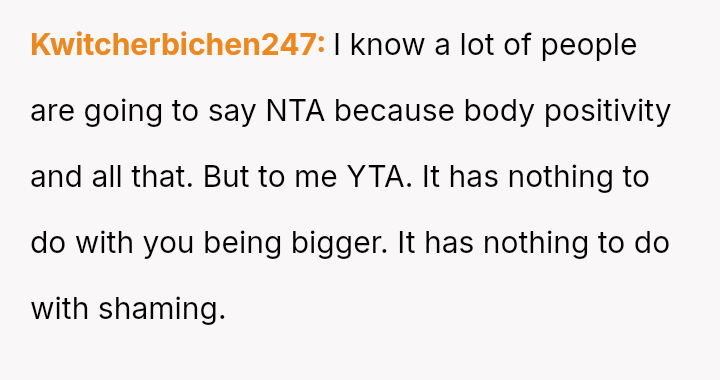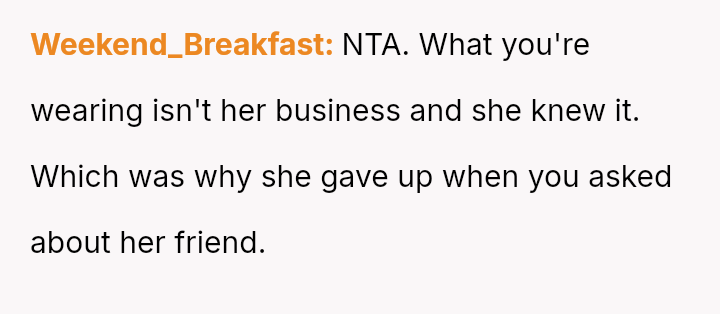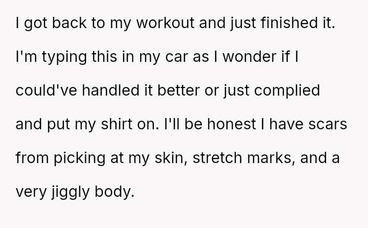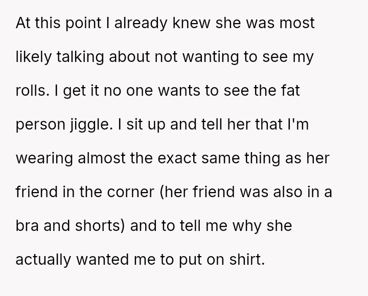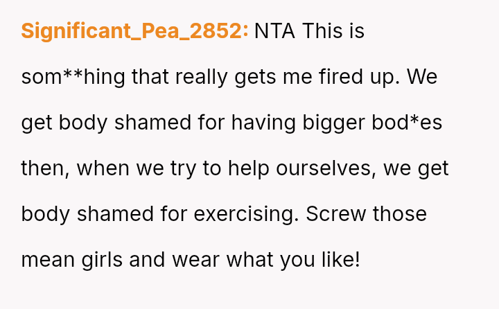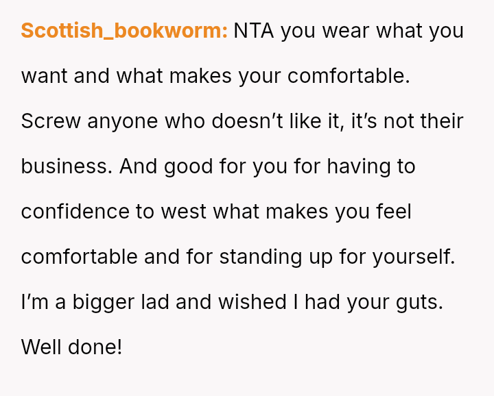The OP a*serted their right to wear what they felt was appropriate functional attire, leading to a direct confrontation where they felt judged based on their body shape.