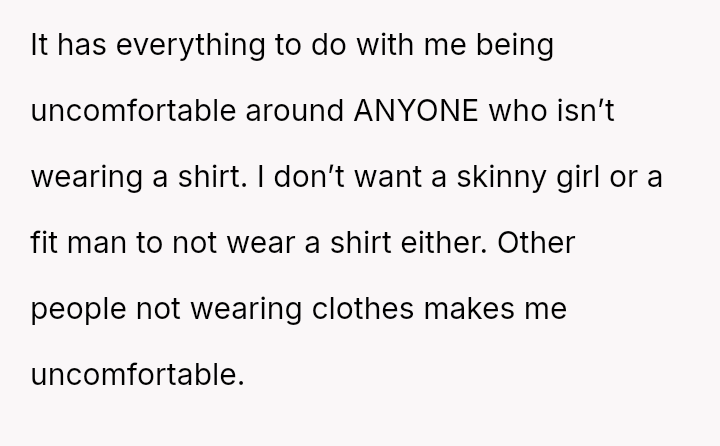 The debate centers on personal comfort and es**blished norms versus the right of others not to feel uncomfortable by the appearance of a body shape they deem inappropriate.
