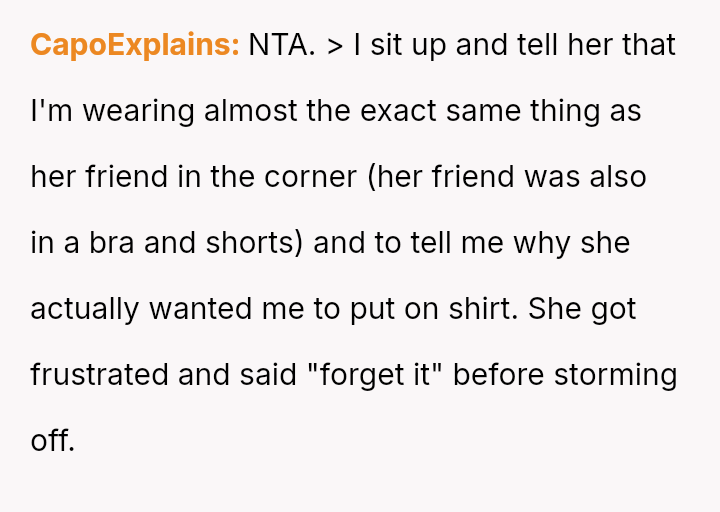 Was the OP justified in refusing to put on a shirt when the attire matched what others were wearing, or should they have complied to maintain perceived politeness and avoid confrontation in a shared space?