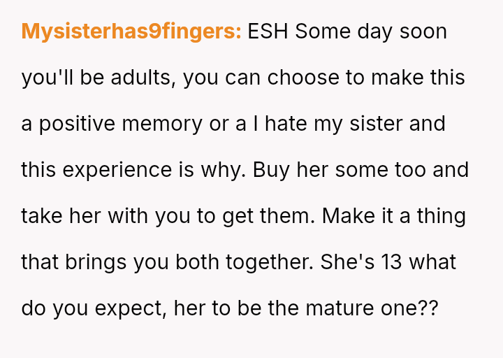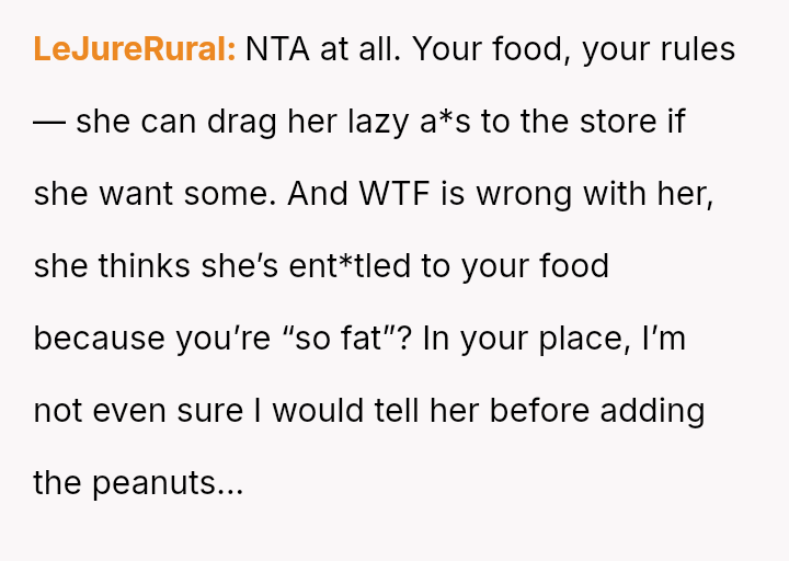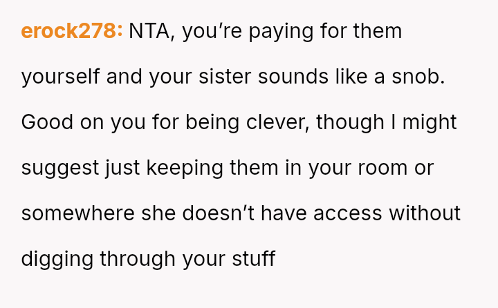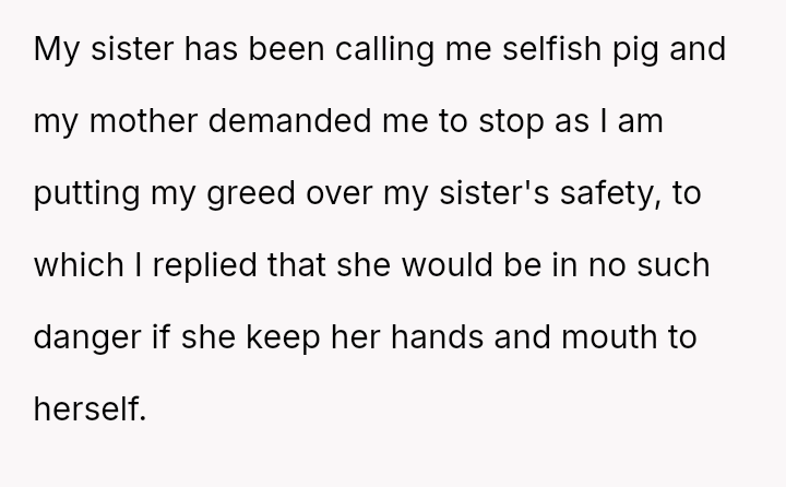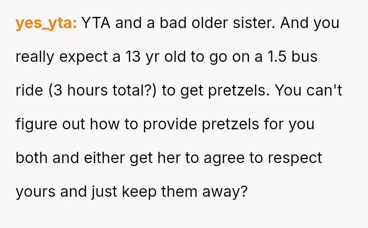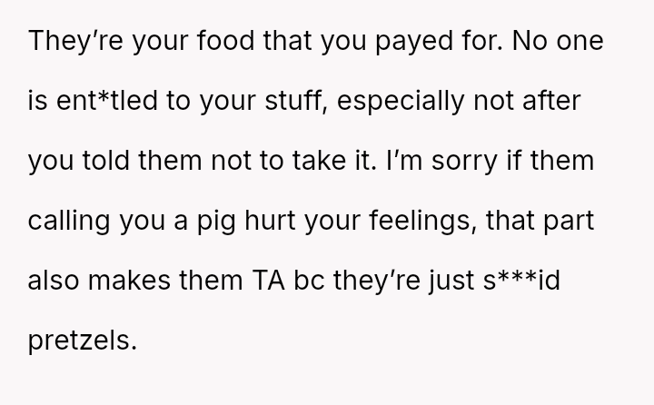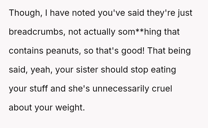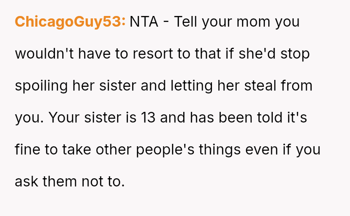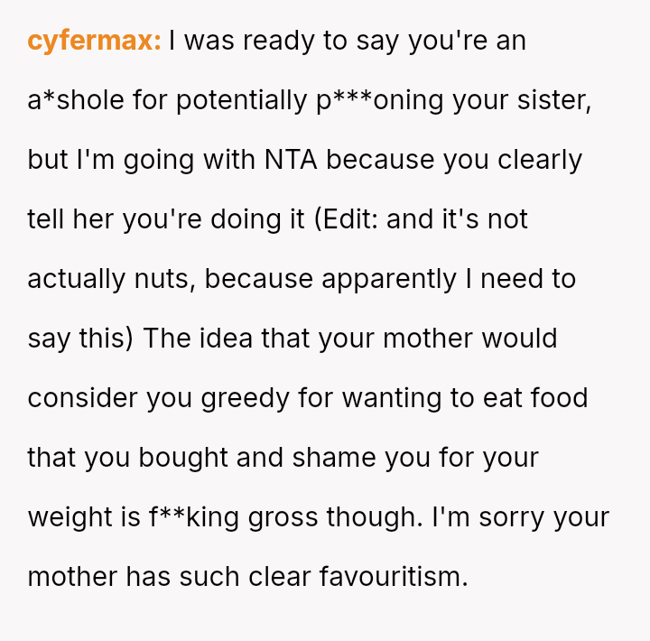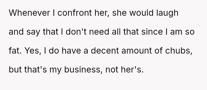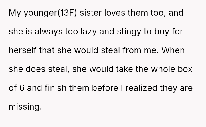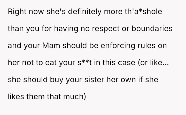 The original poster (OP) is facing persistent theft of her favorite snacks by her younger sister, coupled with body-shaming comments from the sister and a lack of support from their mother.