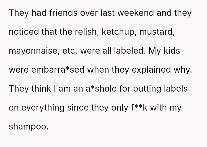 Given that the children have refused to compensate for the wasted product, is the OP justified in applying restrictive, highly visible warning labels to all household items to prevent future damage, or does this action escalate the conflict beyond a reasonable response to boundary v***ations?