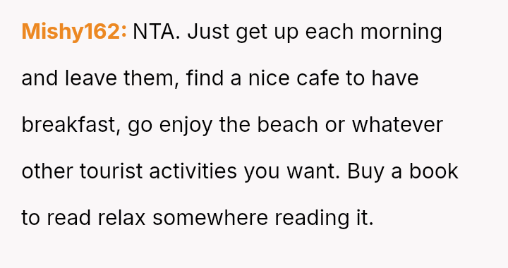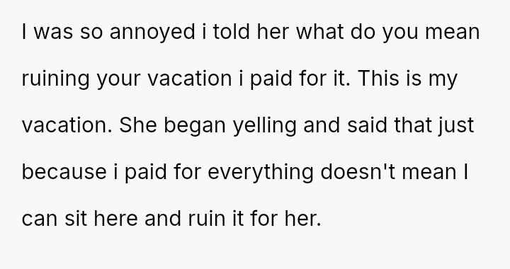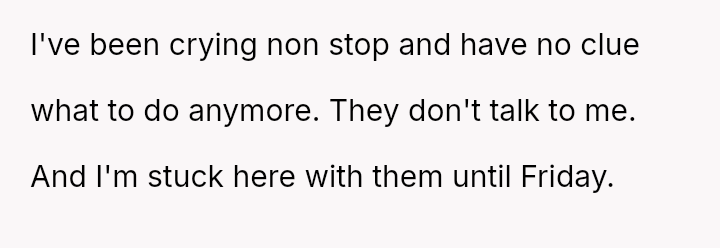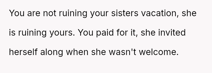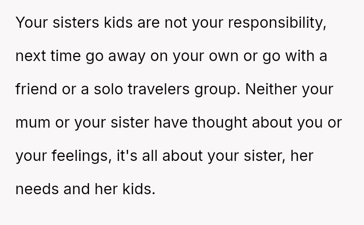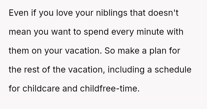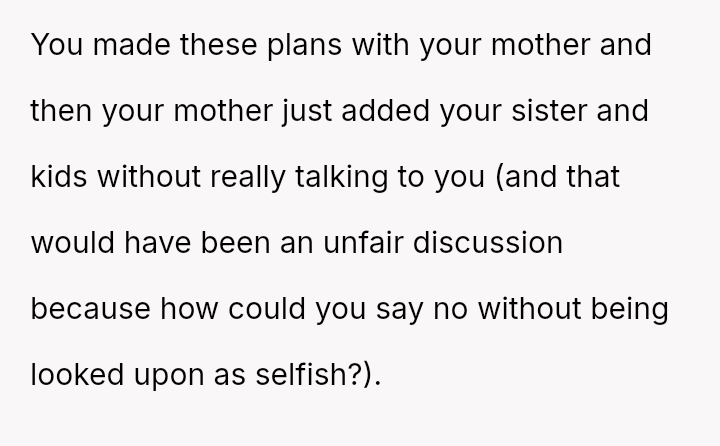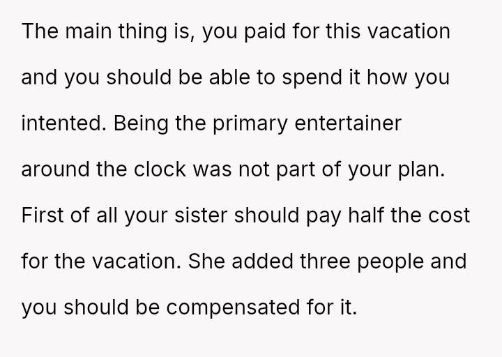 The original poster (OP) is experiencing significant emotional distress because a vacation planned and paid for selfishly for themselves has turned into an unpaid childcare obligation, directly conflicting with their known need for quiet and alone time as an introvert.