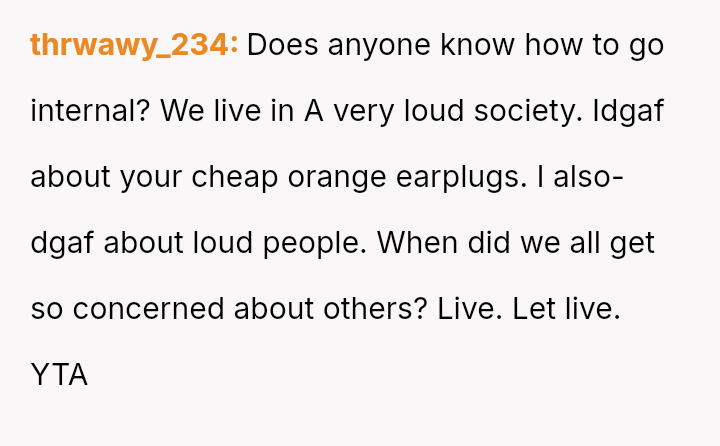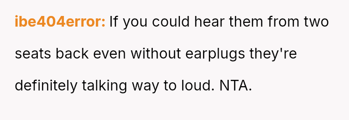 The central conflict lies between the OP's right to peace and quiet during travel, even with protective measures like earplugs, versus the other party's right to converse, even if loudly, without facing public confrontation.