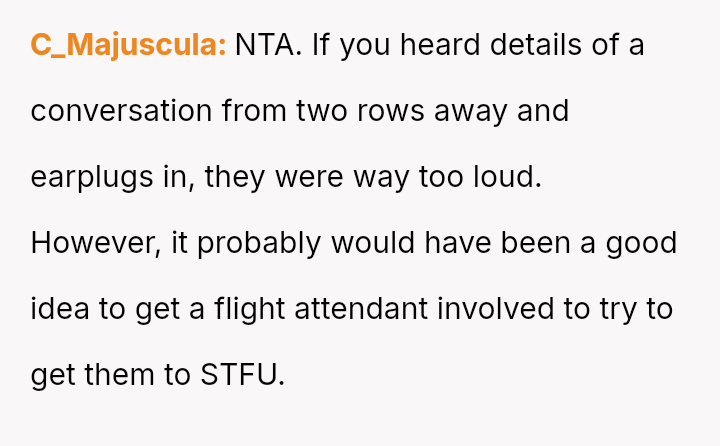 The original poster (OP) experienced significant auditory distress due to the loud conversation of nearby pa*sengers and reacted by directly confronting them, which escalated into an argument where the OP felt justified in their need for quiet after enduring the noise for the entire flight.