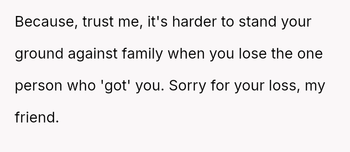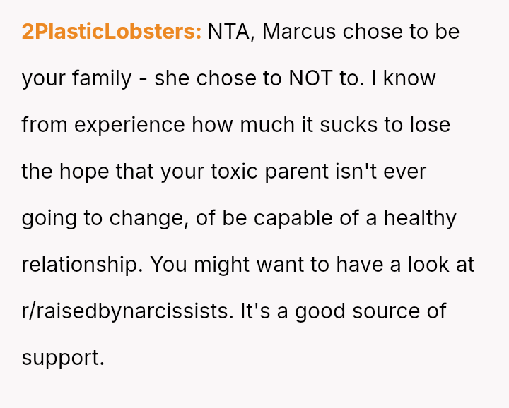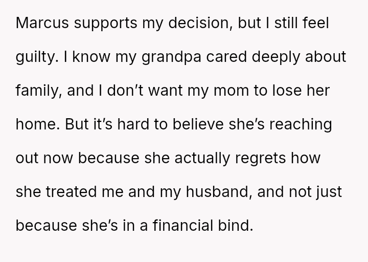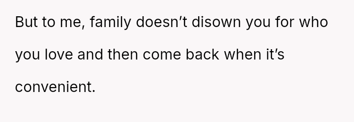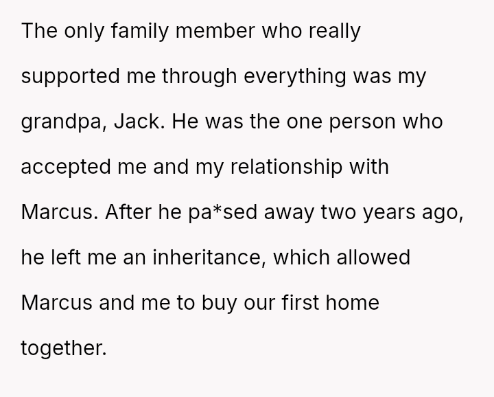 The OP found support only from his grandfather, Jack, who accepted him and Marcus. After Jack pa*sed away two years ago, he left the OP an inheritance used to buy a home with Marcus.