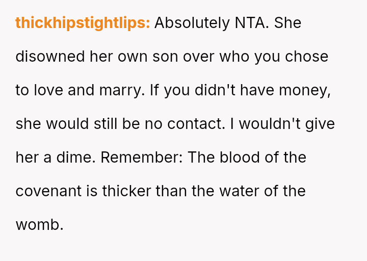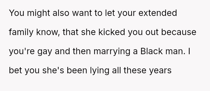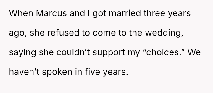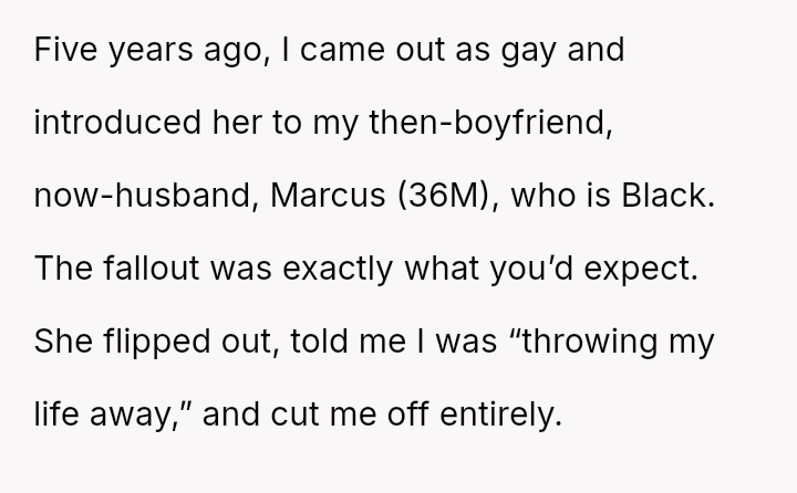 When the OP came out as gay five years ago and introduced his then-boyfriend, Marcus (who is Black), his mother reacted strongly, disowning him and refusing to attend his wedding three years later.