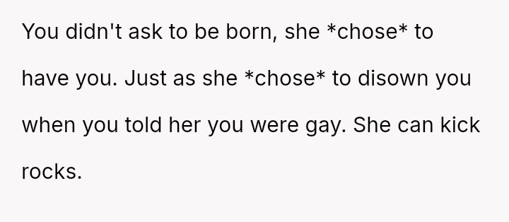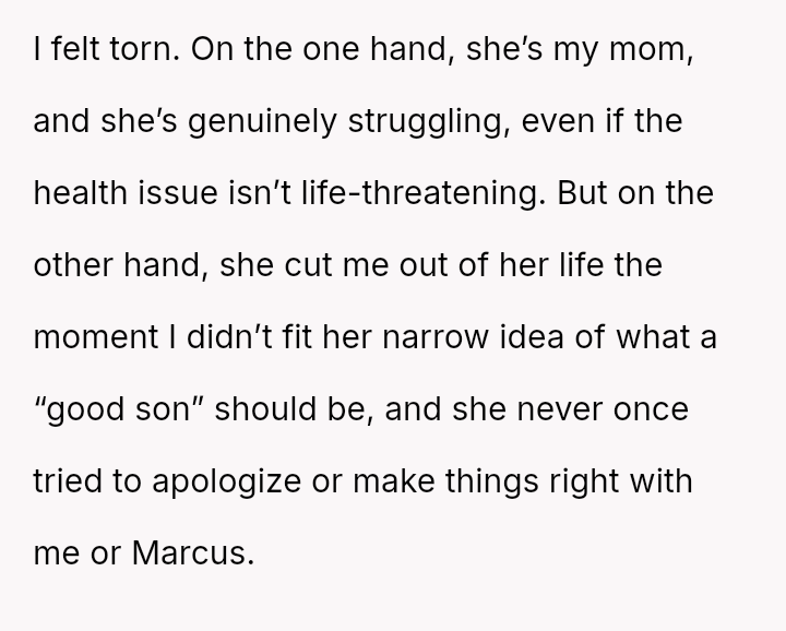 The central conflict lies between his mother's immediate need for financial aid, stemming from a difficult life situation, and his need to maintain boundaries against someone who actively rejected him and his husband for years without offering any genuine amends.