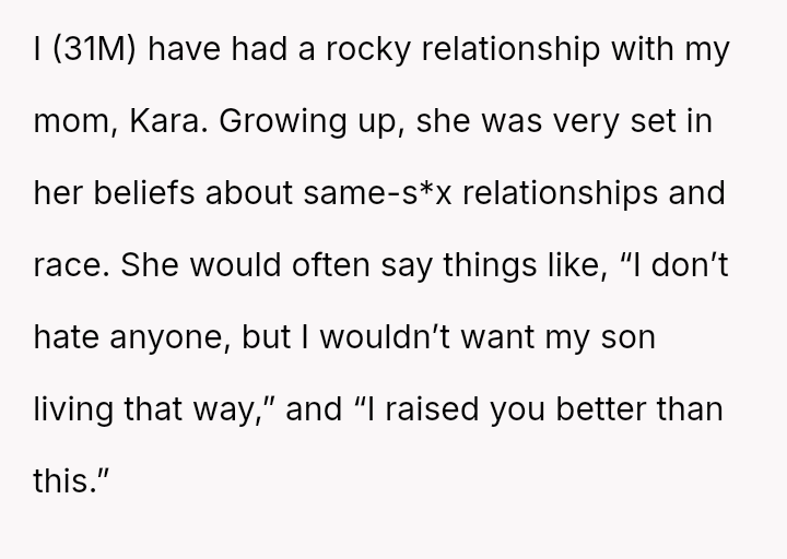 The individual, a 31-year-old man (OP), describes a strained relationship with his mother, Kara, rooted in her long-standing, traditional beliefs regarding same-s*x relationships and race.