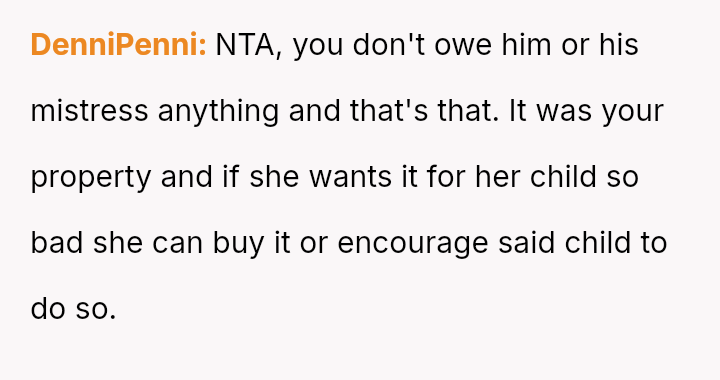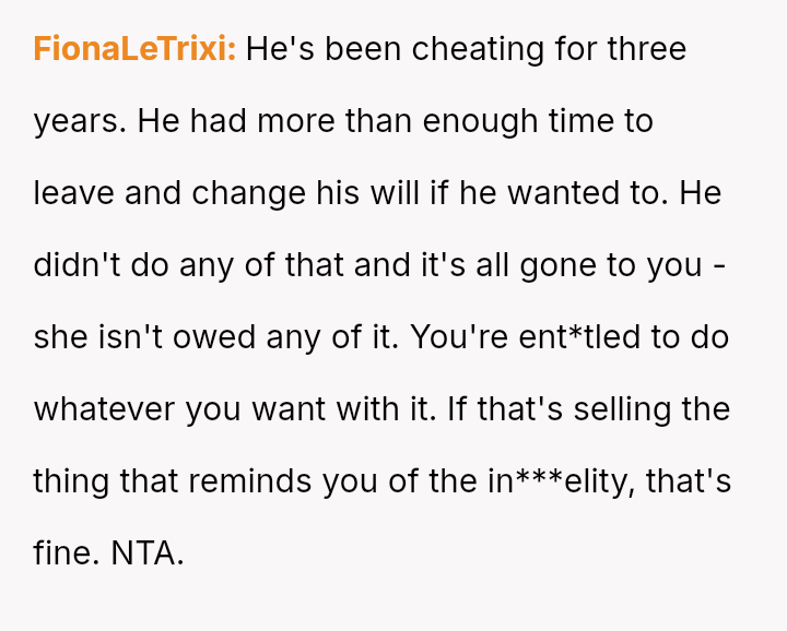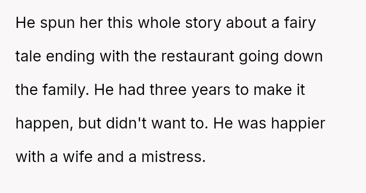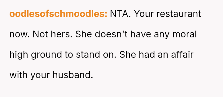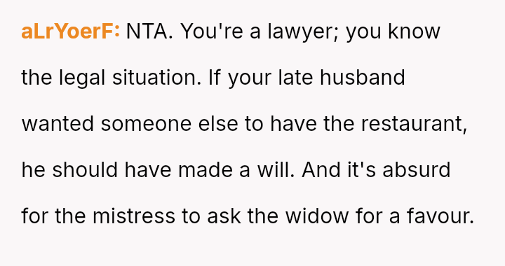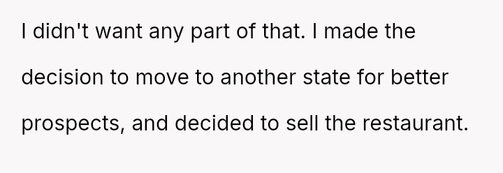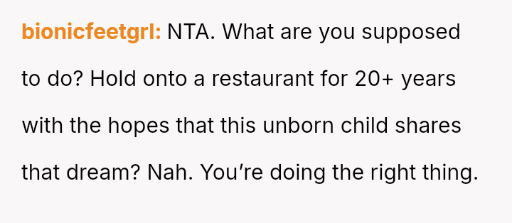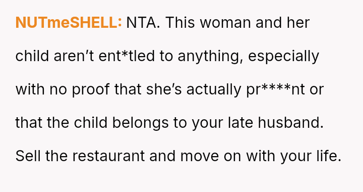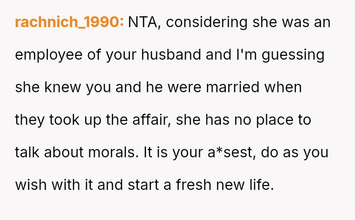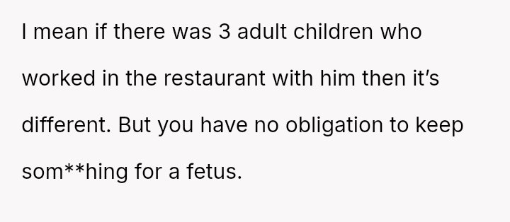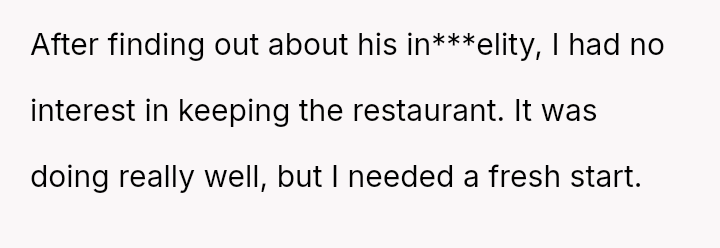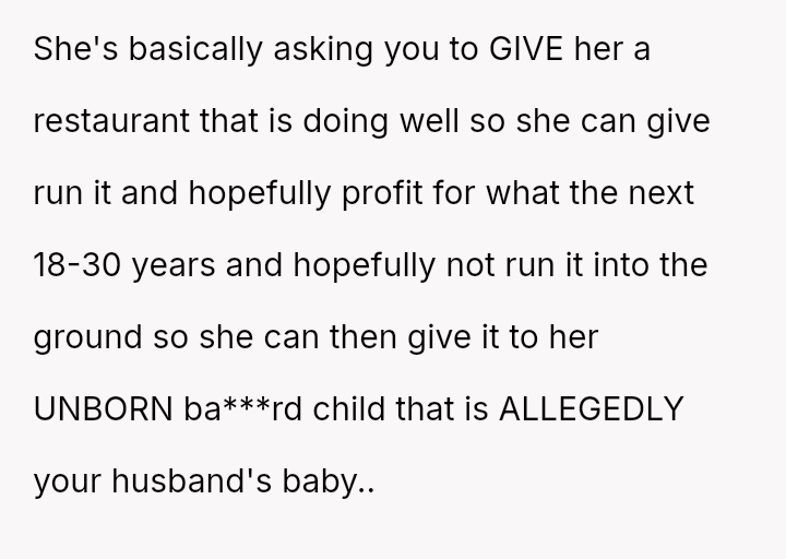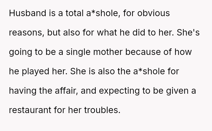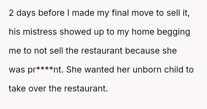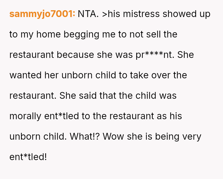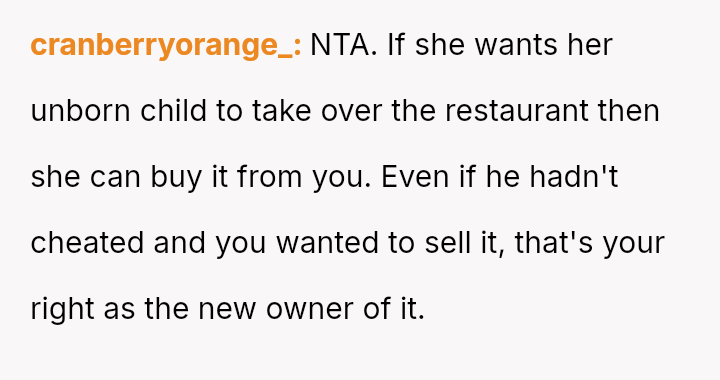 Given the OP's legal right to the a*set and her clear desire for emotional closure, is she obligated, morally or otherwise, to transfer the profitable restaurant to the mistress's unborn child, or does her decision to sell the a*set and sever all ties represent a justifiable exercise of autonomy following severe marital betrayal?