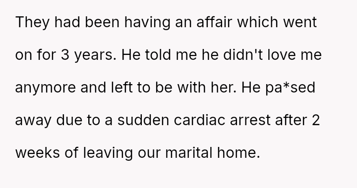 Married young, dreams intertwined, she faced the cruel sting of discovering her husband’s secret affair just weeks before his sudden death—a heartbreak compounded by the unfinished threads of their marriage and the heavy legacy he left behind.