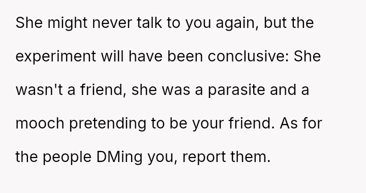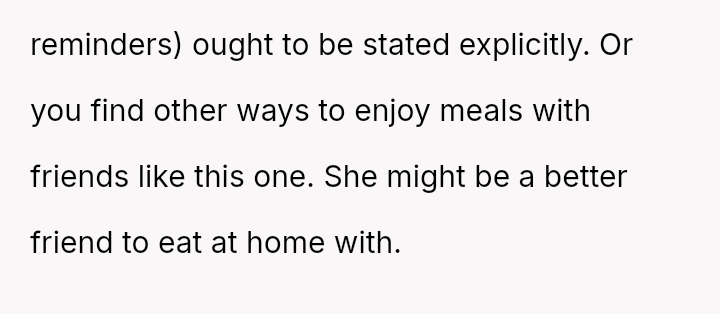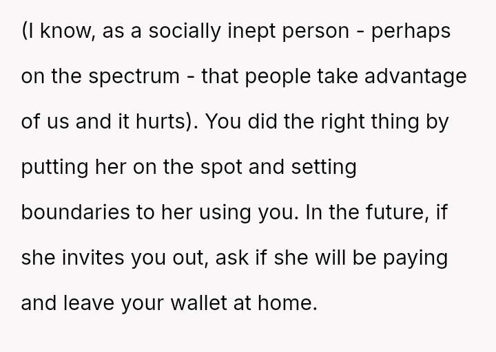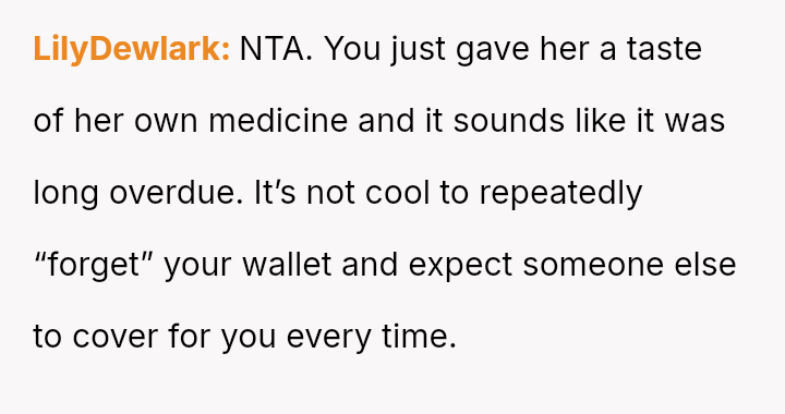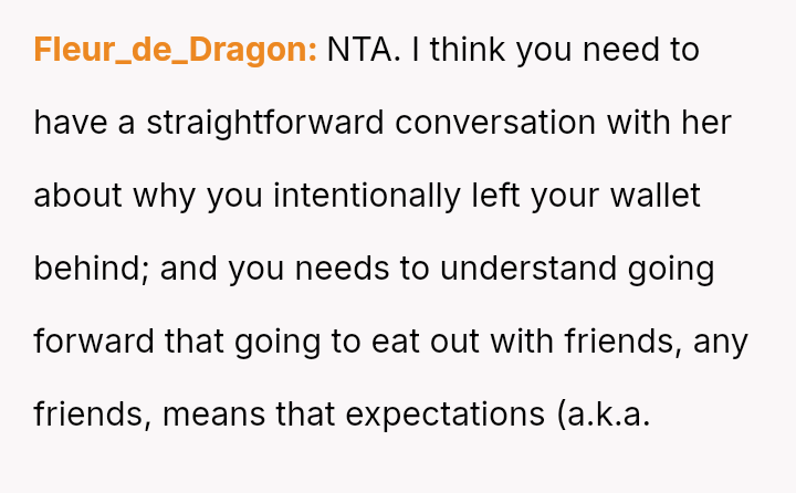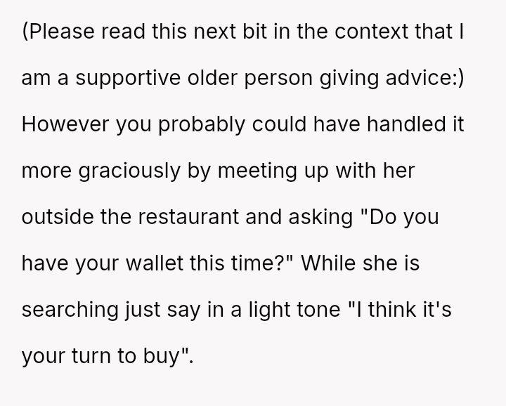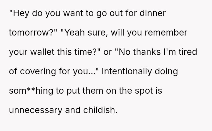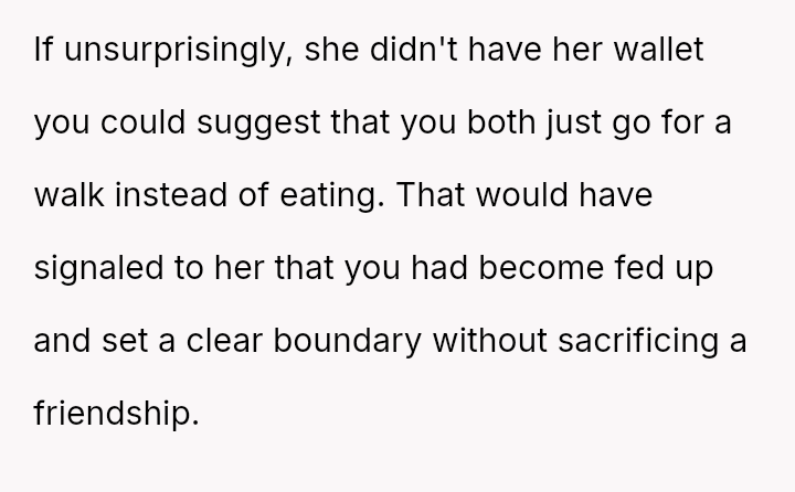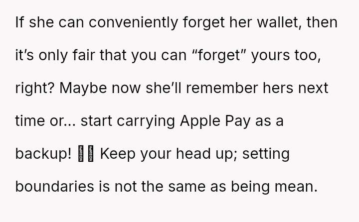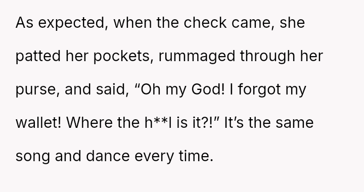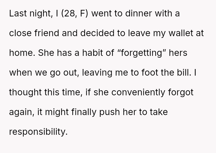 To address this pattern, the user intentionally left her own wallet at home during a recent dinner. As anticipated, the friend claimed to have forgotten hers again, but the user mirrored the excuse.