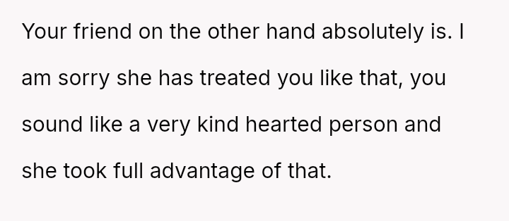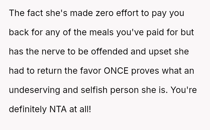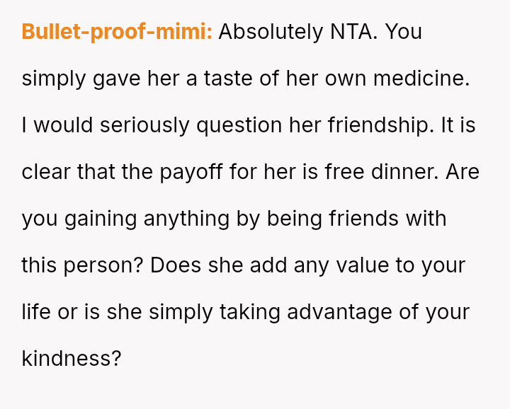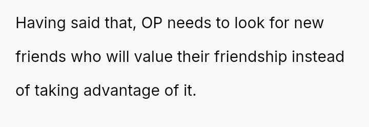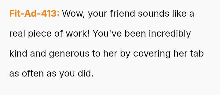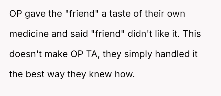 The original poster (OP) reached a breaking point regarding the friend's repeated financial irresponsibility, choosing a pa*sive-aggressive confrontation by mirroring the behavior rather than having a direct talk.