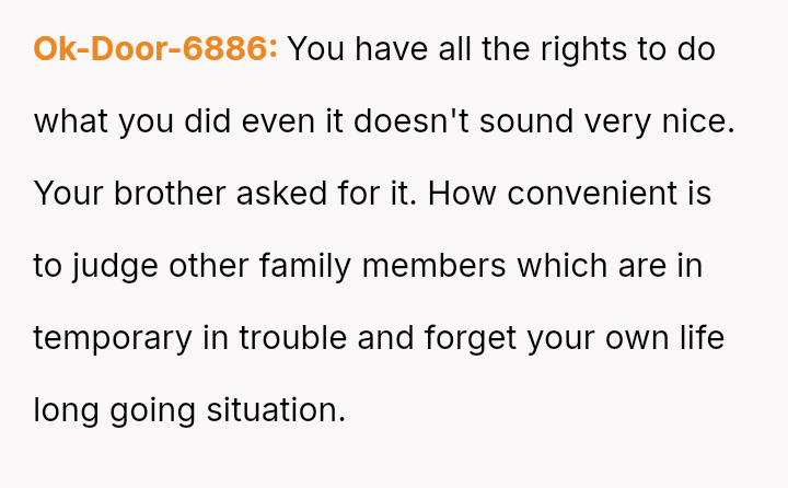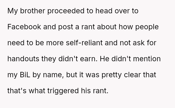 While the OP supports his brother financially without issue, he felt compelled to challenge the brother's public critique of 'handouts' when his own request for a*sistance for his brother-in-law (BiL) triggered the response.