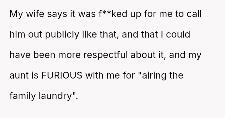 The central conflict lies between the OP's belief that his public challenge was justified retaliation for the brother's public shaming, and the resulting anger from his wife and aunt who feel he v***ated family privacy and respect.