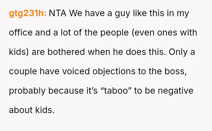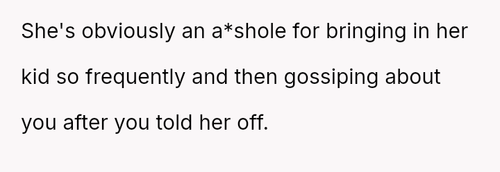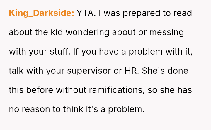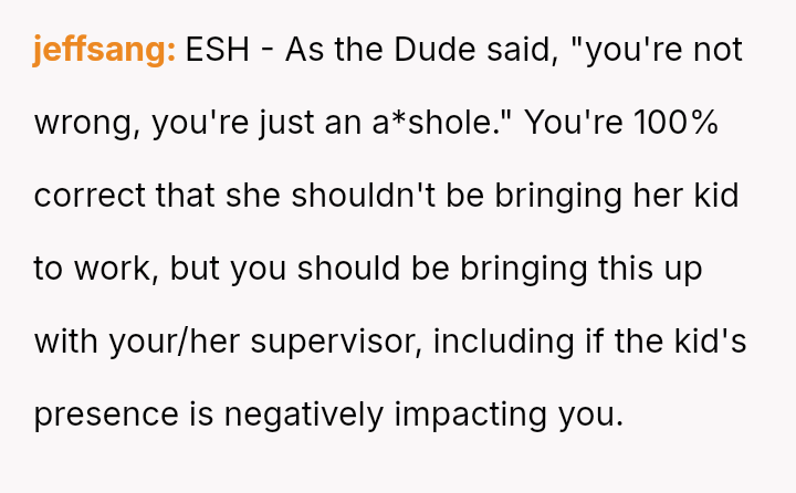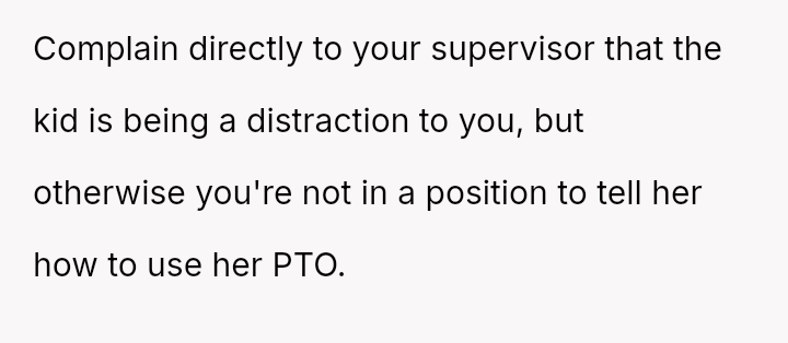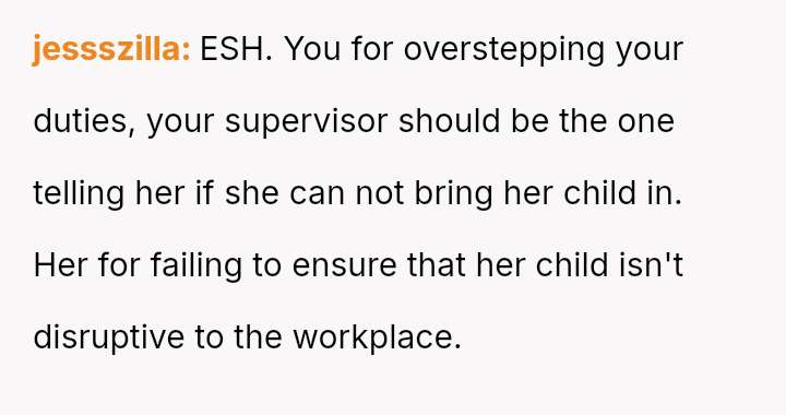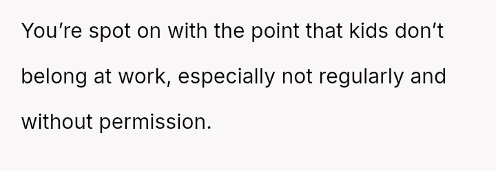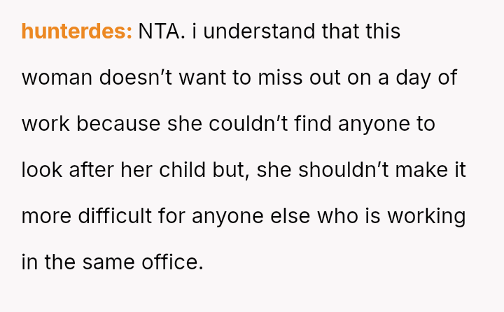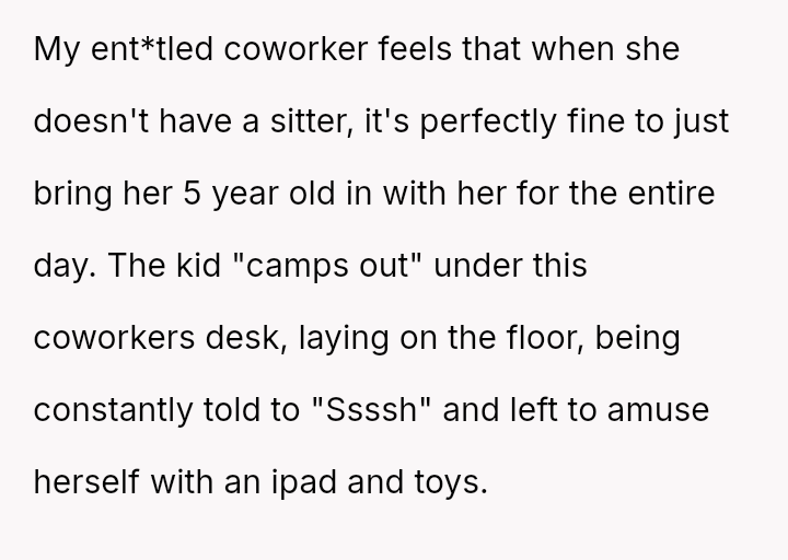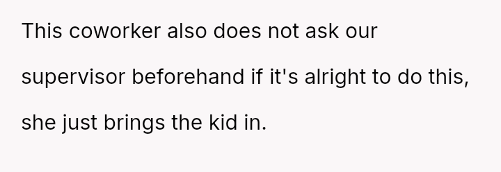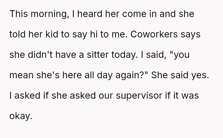 The original poster (OP) expressed clear frustration with a coworker's recurring pattern of bringing her child to the office for full days when childcare falls through, viewing this action as disruptive and unfair to professional responsibilities.