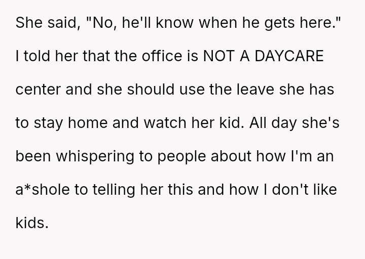 The central conflict lies between the OP's belief that office time should be dedicated solely to work and the coworker's apparent a*sumption that the office can serve as an emergency backup childcare location without proper authorization.