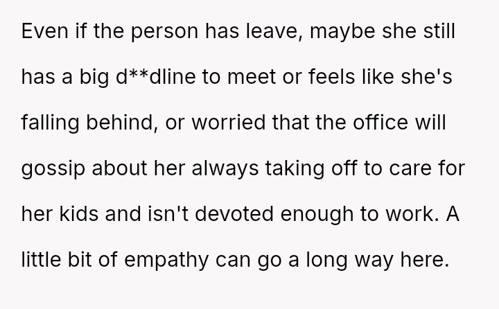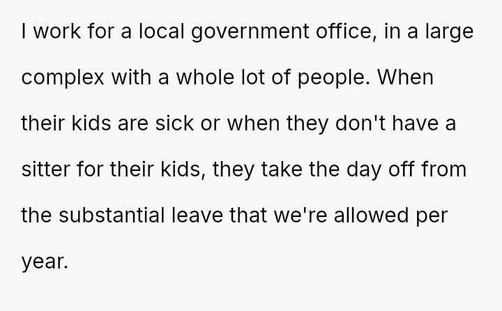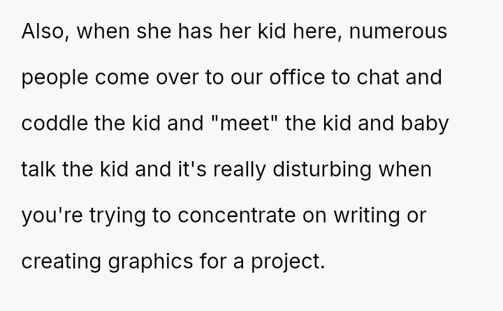 Instead of taking rightful leave, she drags her young child into a space meant for focused work, forcing everyone around to navigate the chaos of whispered shushes and constant distractions.
