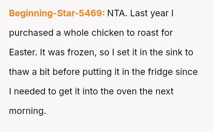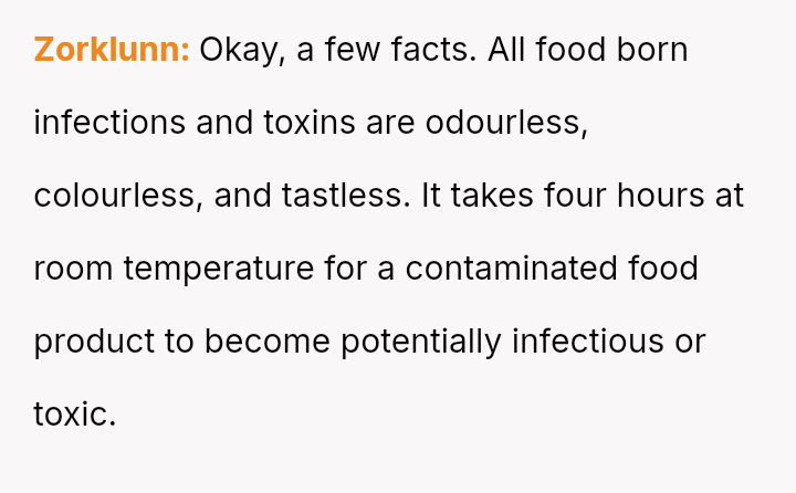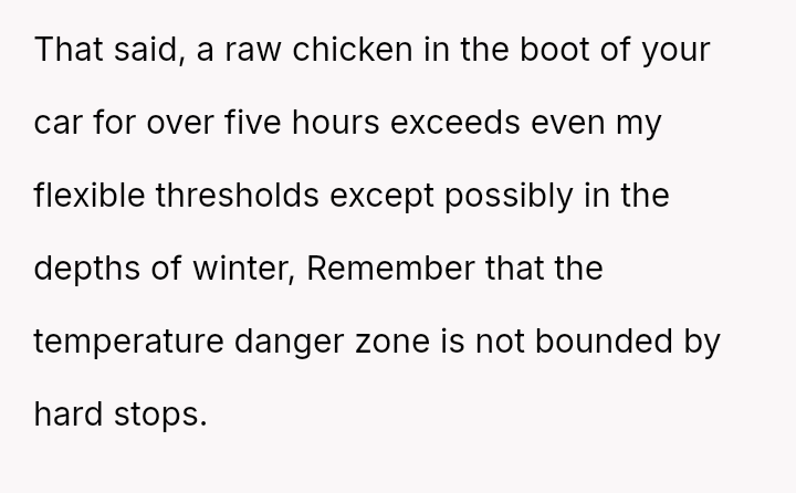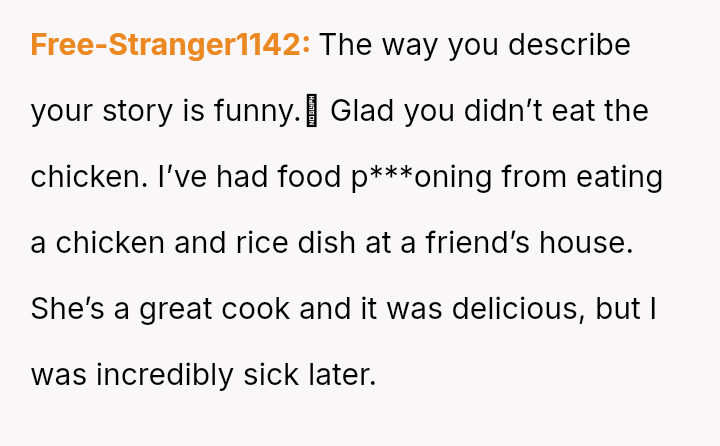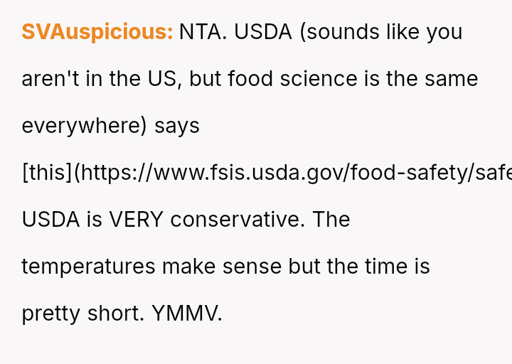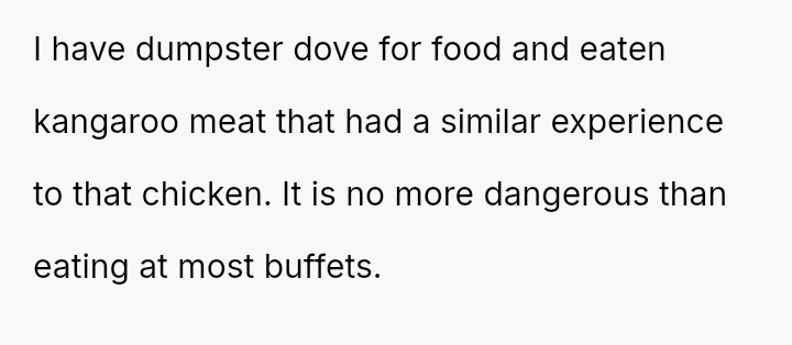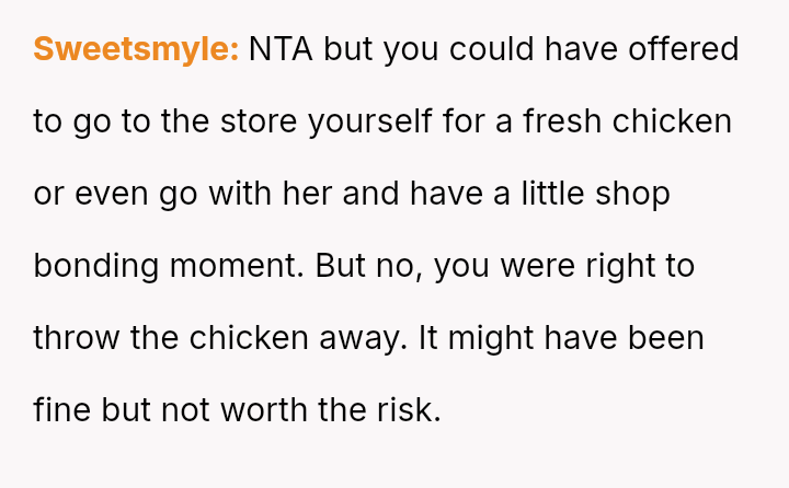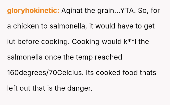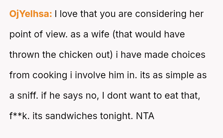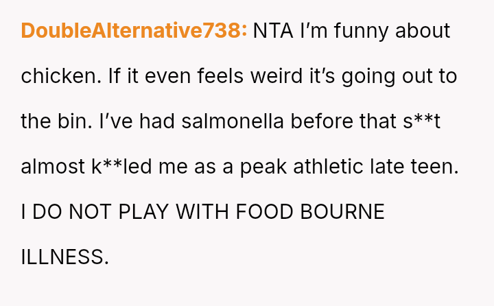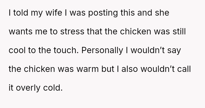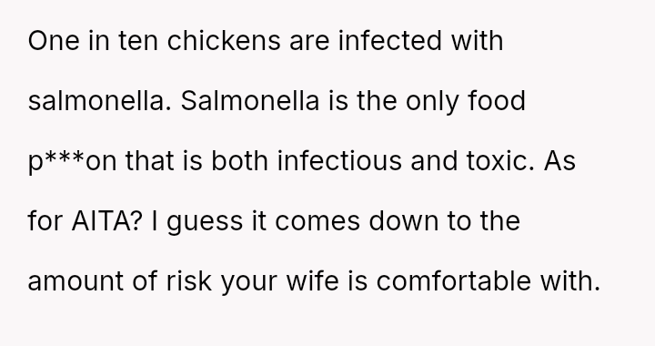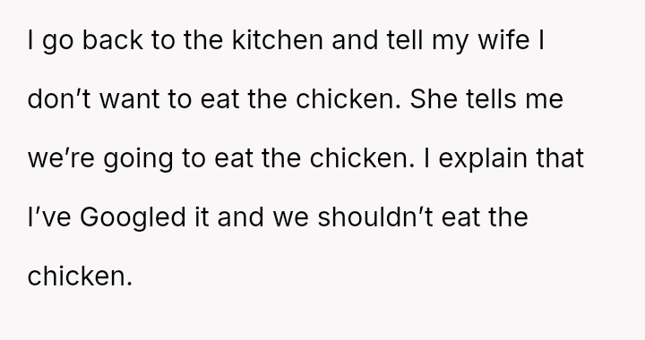 Was the OP justified in refusing to eat chicken that had been stored improperly for several hours, even if his wife insisted it was still safe, or was his refusal an overreaction that dismissed her effort to cook for him?