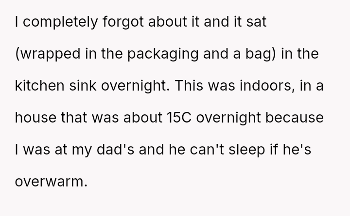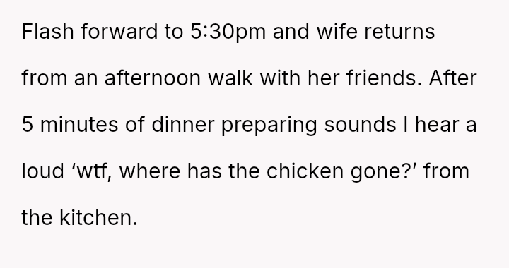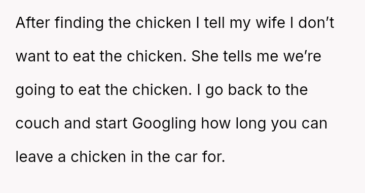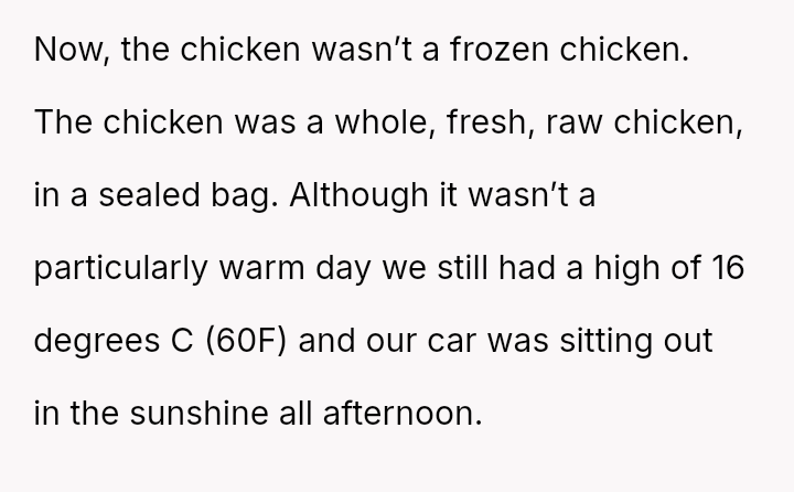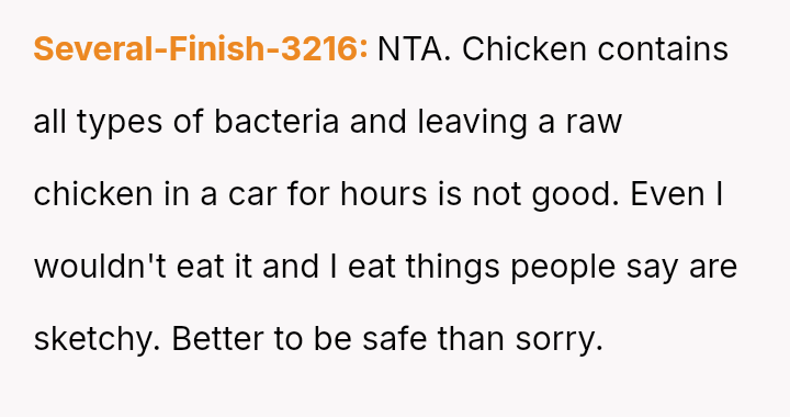 The central conflict stemmed from the OP's refusal to eat raw chicken left in a warm car, which his wife insisted on preparing and serving, ultimately causing her to leave in frustration.
