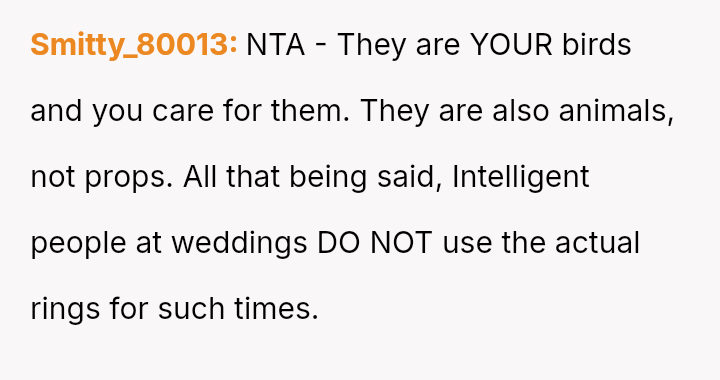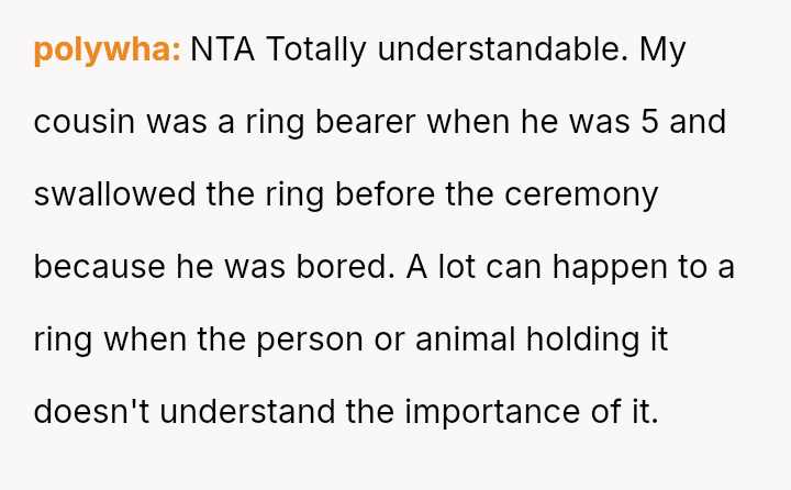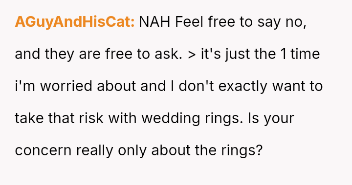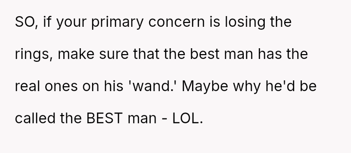 Is the original poster correct in refusing to risk the wedding rings for the sake of a dramatic entrance, or should they yield to their friend's absolute confidence and the significance of the event, even if it means accepting a small but potentially catastrophic liability?
