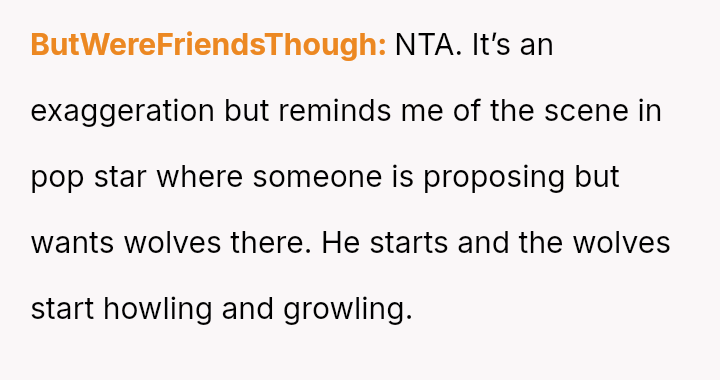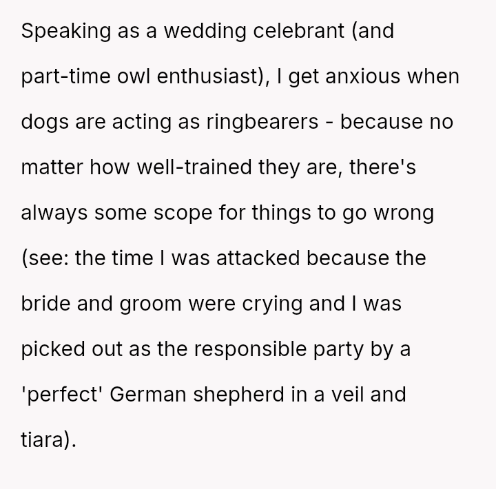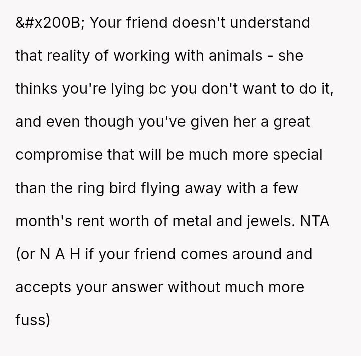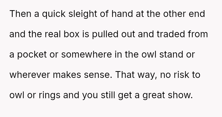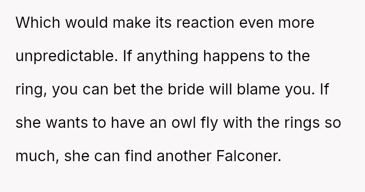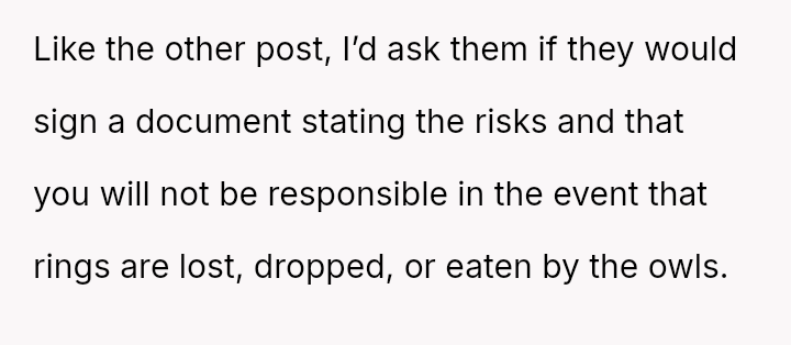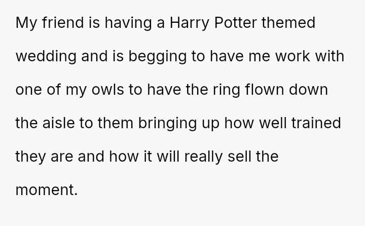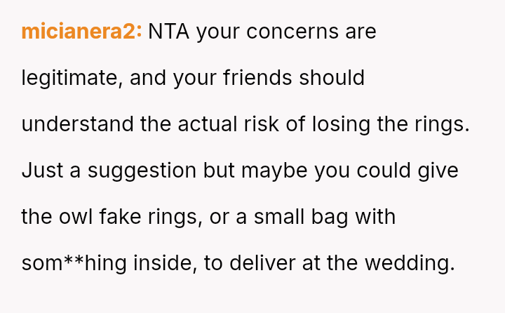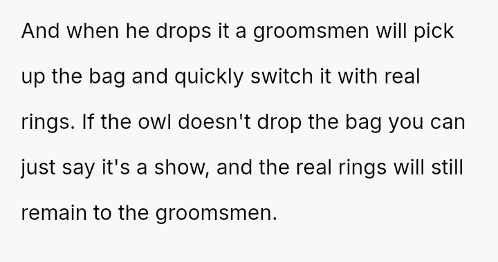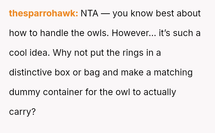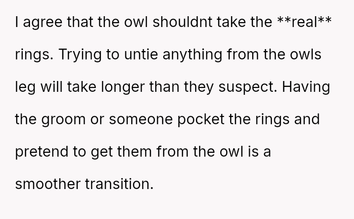 While the friend desires a spectacular moment using the owl delivery service, the poster is prioritizing the safety of the wedding rings and the reliability of the performance over the friend's emotional request.