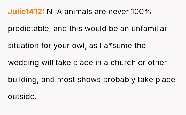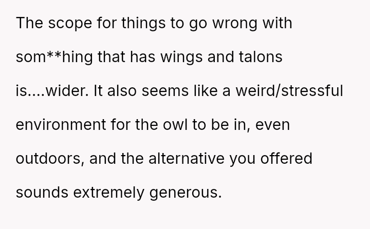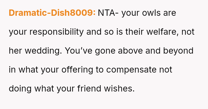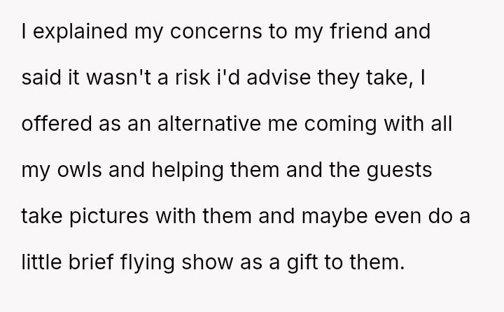 The original poster is facing a conflict between honoring a close friend's major life event and maintaining professional standards and personal comfort regarding a high-stakes activity involving their trained owls.