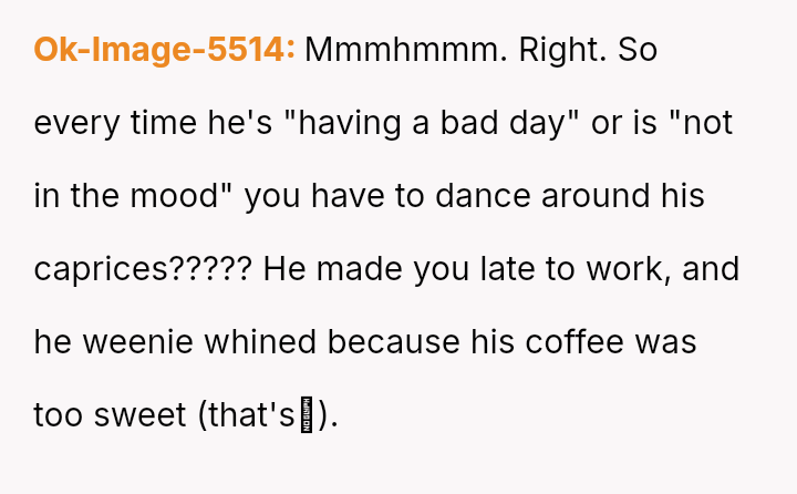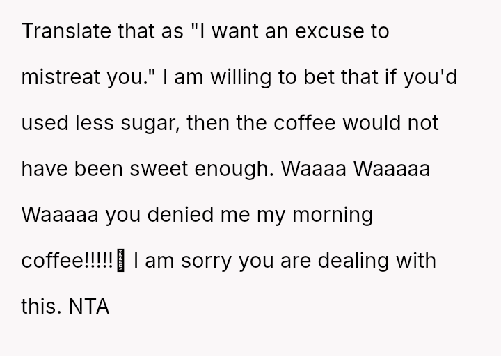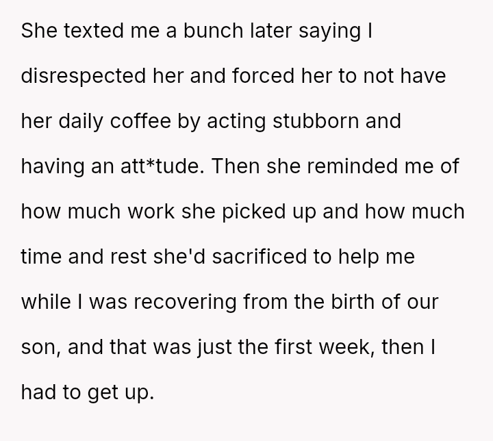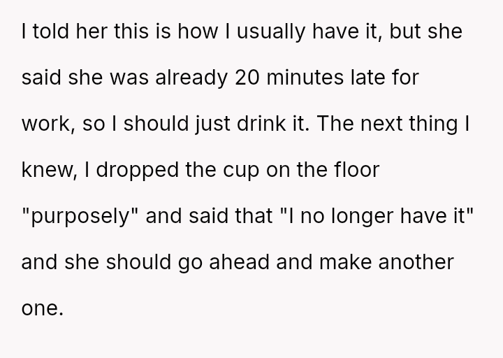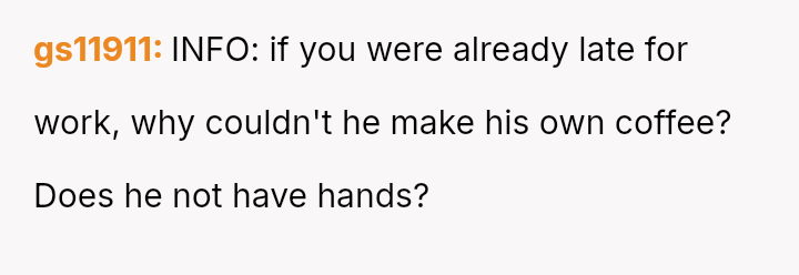 The original poster (OP) faced a sudden demand from her husband for a change in routine coffee preparation while already running late for work.