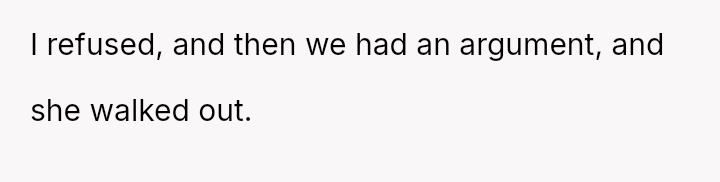 Her decision to refuse, stemming from feeling pressured and disrespected by his subsequent intentional destruction of the first cup, highlights a significant conflict between her need to adhere to her schedule and his expectation of immediate accommodation, even when he initiated the request under poor emotional circumstances.