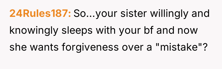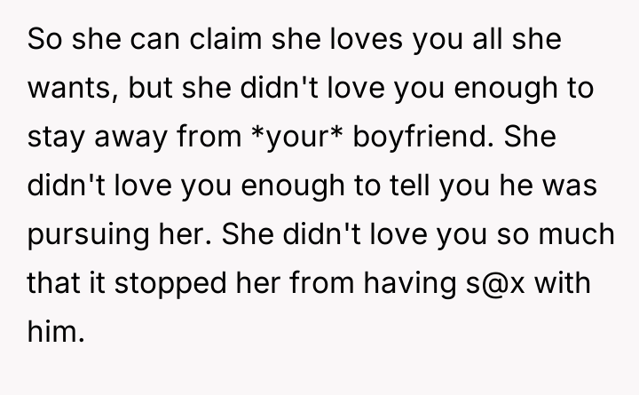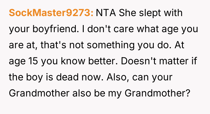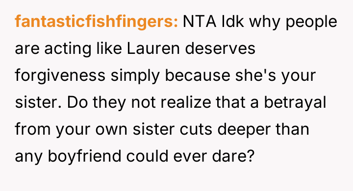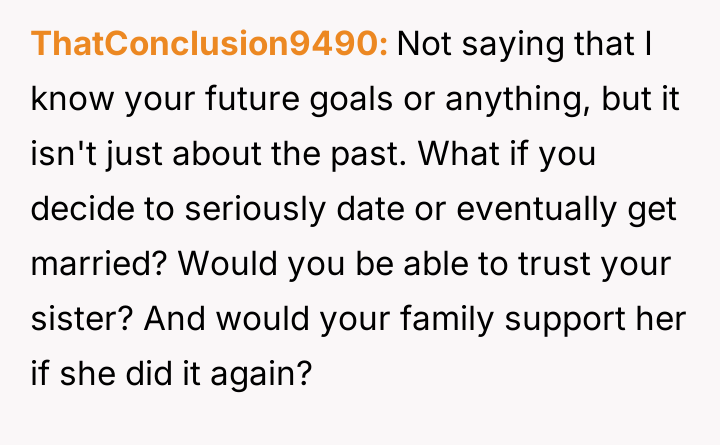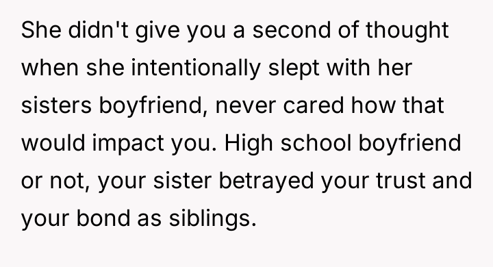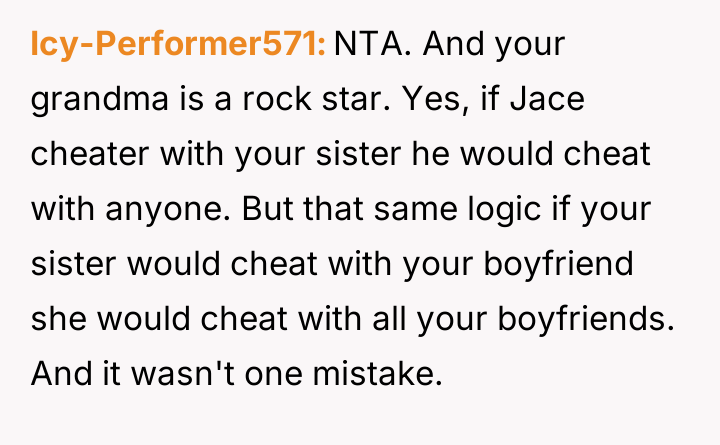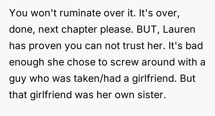 When the original poster (OP) was 14, she began dating Jace, who was 15. She had a close friendship with her older sister, Lauren, and believed they shared everything.