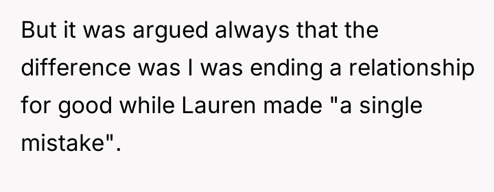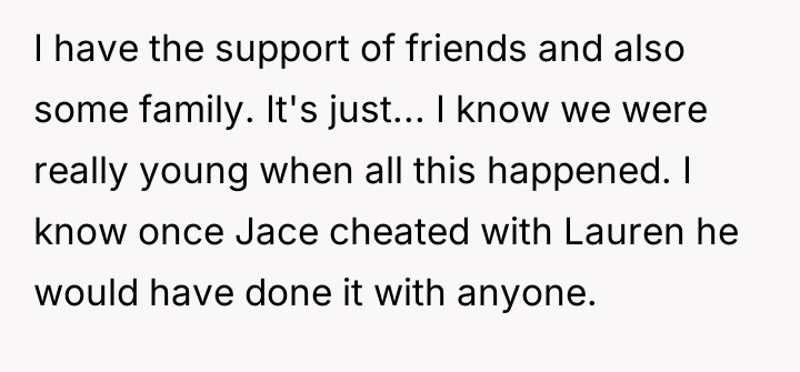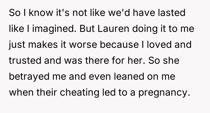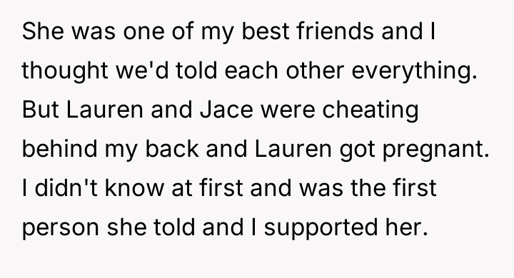 This trust was broken when Lauren and Jace began cheating on the OP together, which eventually resulted in Lauren becoming pregnant.