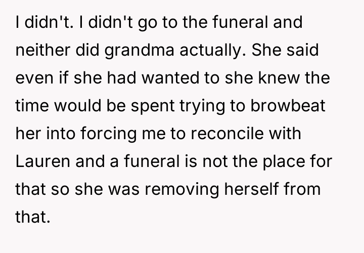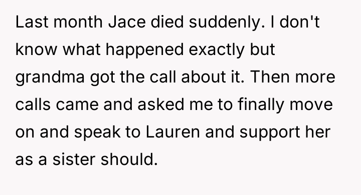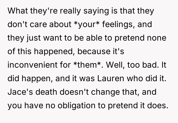 The question is whether the OP is wrong (the 'Asshole') for continuing her no contact boundary with Lauren following Jace's death, or if the severity of the original betrayal justifies prioritizing her own healing over familial reconciliation at this time?
