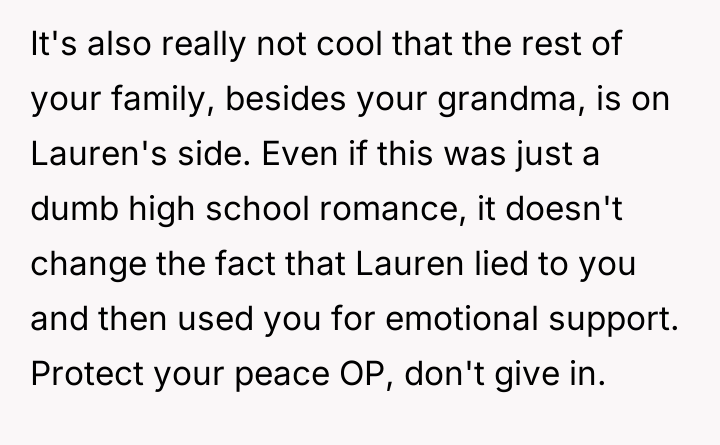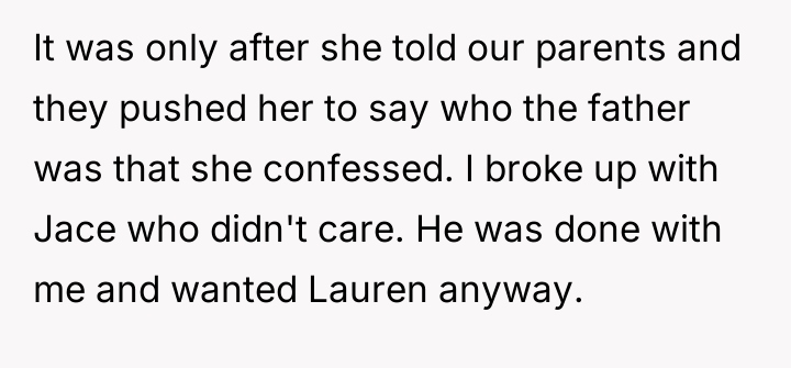 The OP was initially supportive of Lauren until the truth was revealed to their parents, leading to the breakup with Jace, who preferred Lauren.