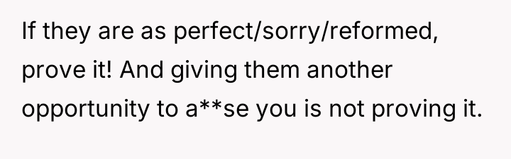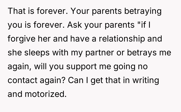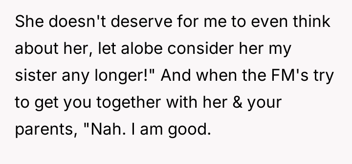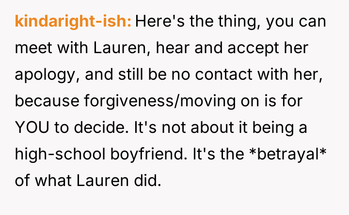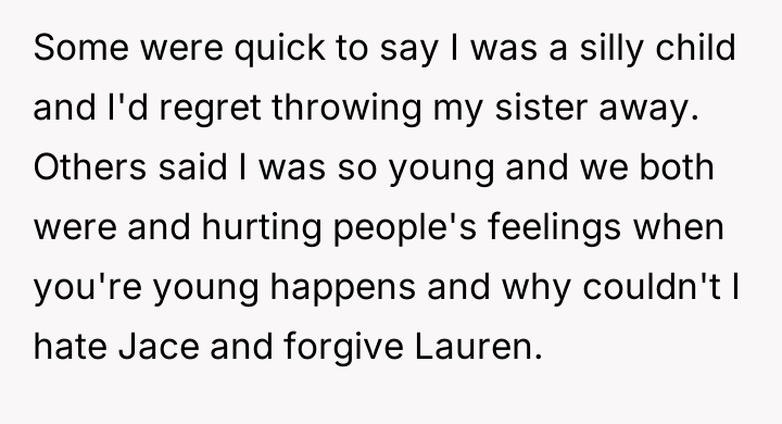 When parental pressure to forgive Lauren and resume the sisterly relationship failed, the OP moved out at 18 and initiated a period of no contact with both Lauren and Jace, a boundary she has maintained for years despite family disagreement.