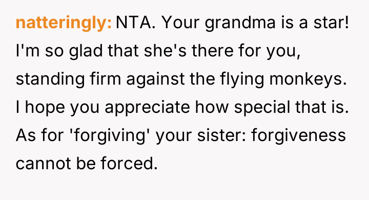 The central conflict for the OP is the deep betrayal felt from her sister, which led her to enforce strict, long-term no contact, a decision that has been consistently supported by her grandmother but heavily criticized by other family members.