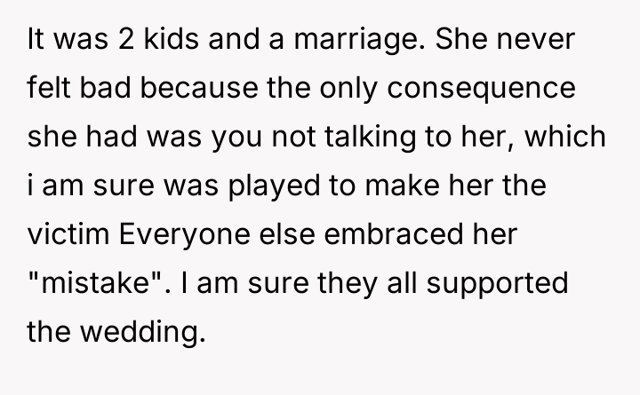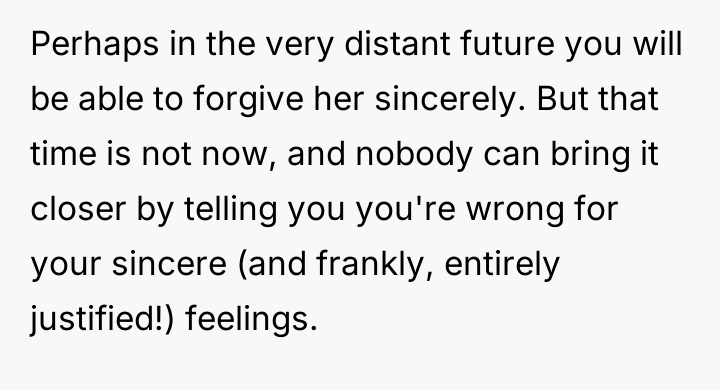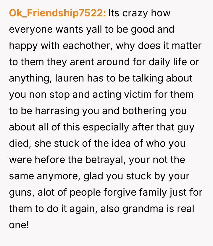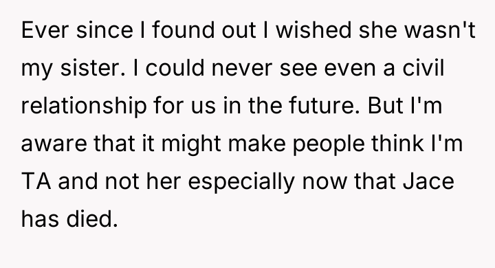 Now, with the unexpected death of Jace, the OP feels significant guilt over maintaining this distance, worrying that her actions are causing emotional strain on Lauren, even though she still views the initial betrayal as unforgivable.