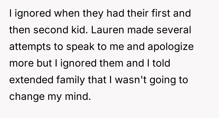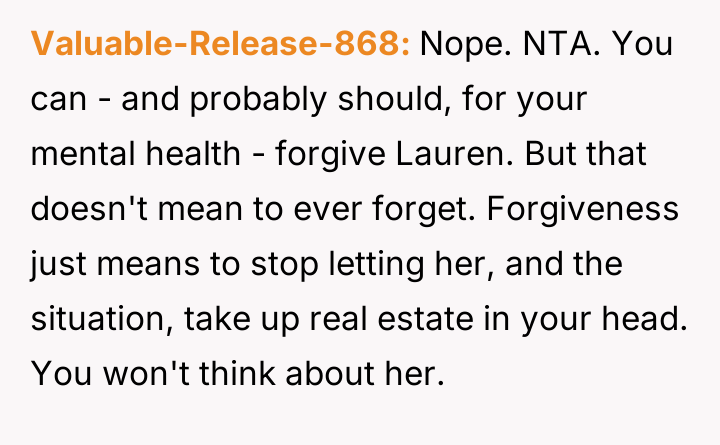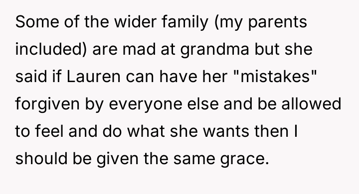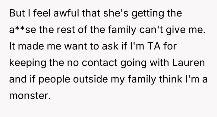 Despite Lauren's pleas for forgiveness and a desire to remain close, the OP cut ties, finding relief when Lauren moved in with Jace's family.