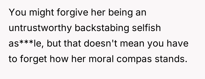Readers must weigh the impact of a formative, severe betrayal against the social expectation to forgive and support a sibling after a tragedy.