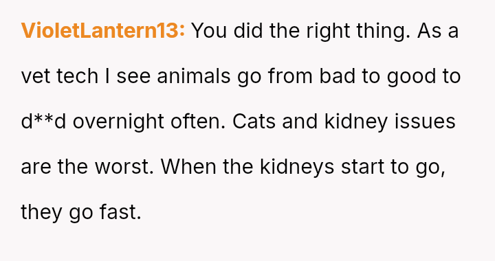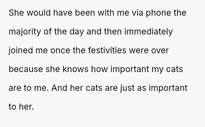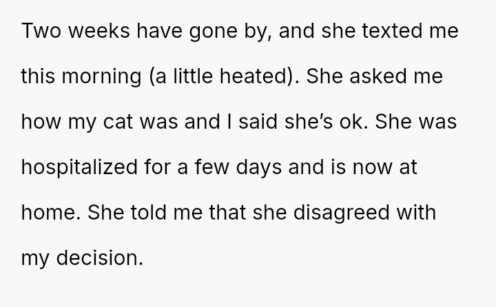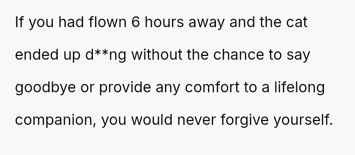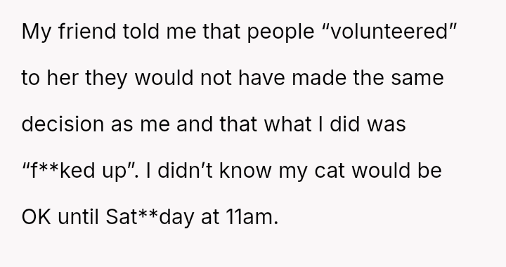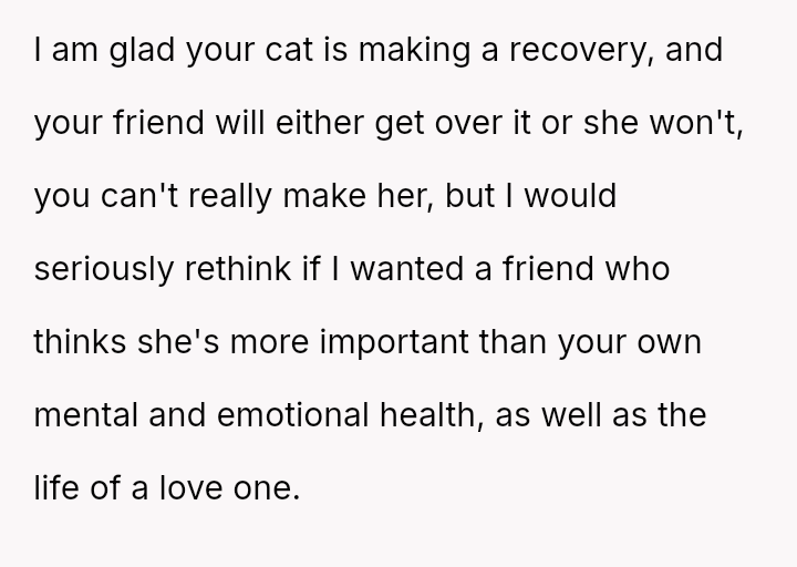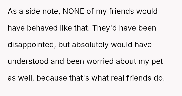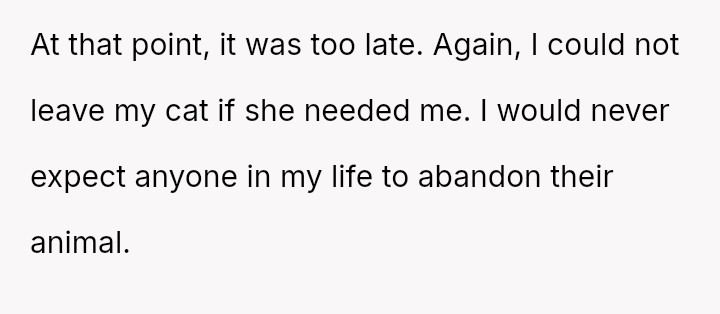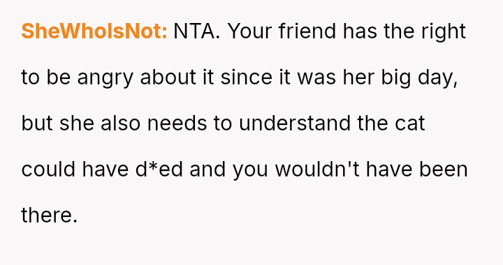 Her decision prioritized the immediate welfare and emotional needs of her vulnerable cat, leading to significant guilt and subsequent strain on the friendship, despite her clear explanation of the emergency.