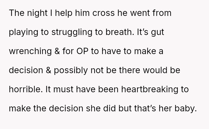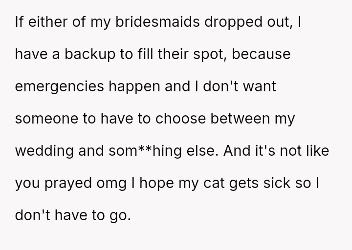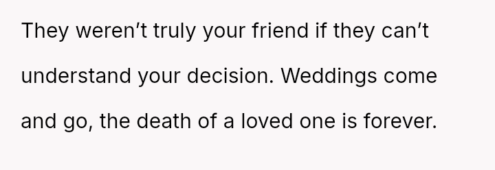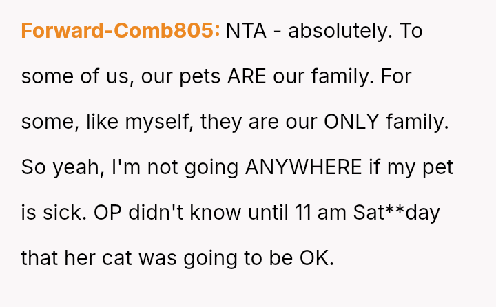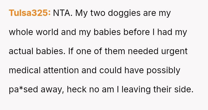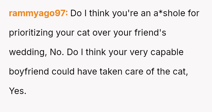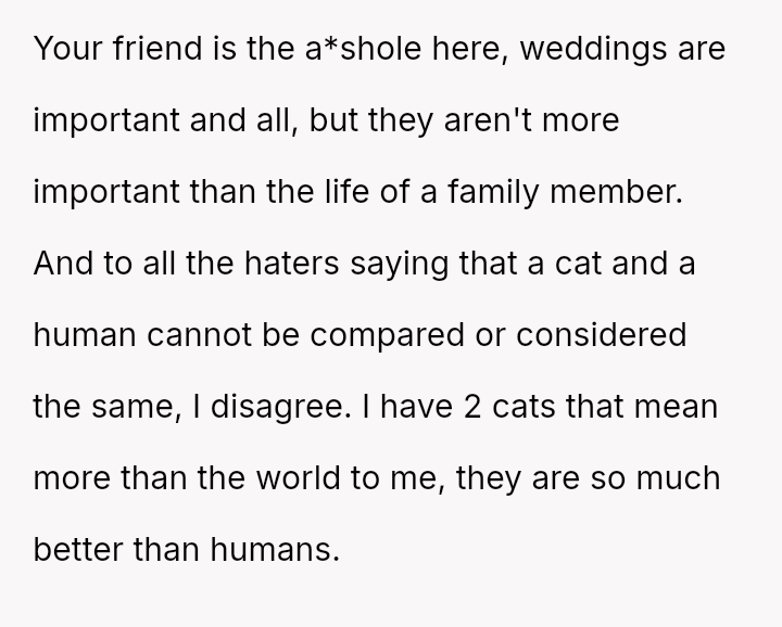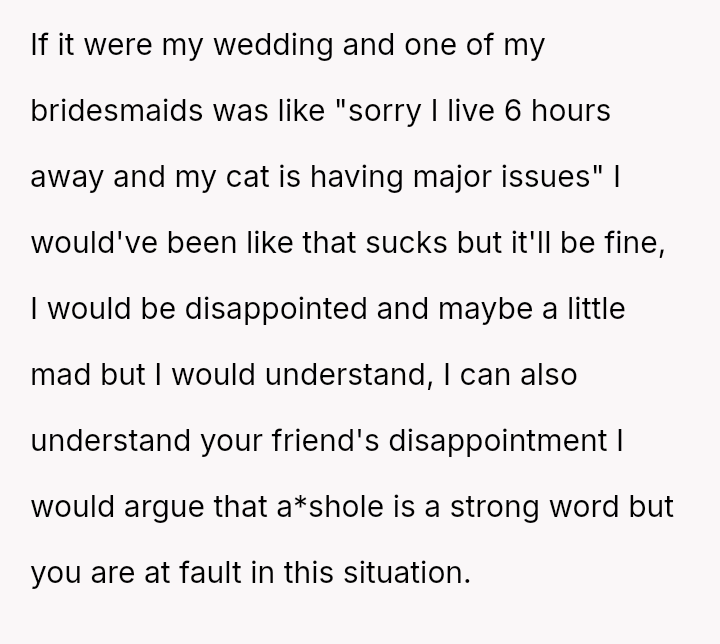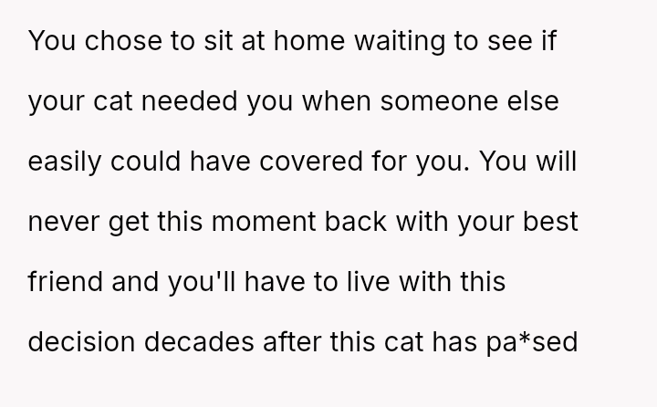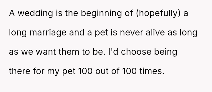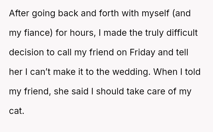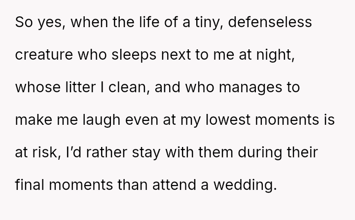 The original poster (OP) faced an intense conflict between a deeply personal responsibility (caring for a seriously ill pet) and a major social obligation (attending her best friend's wedding as a bridesmaid).