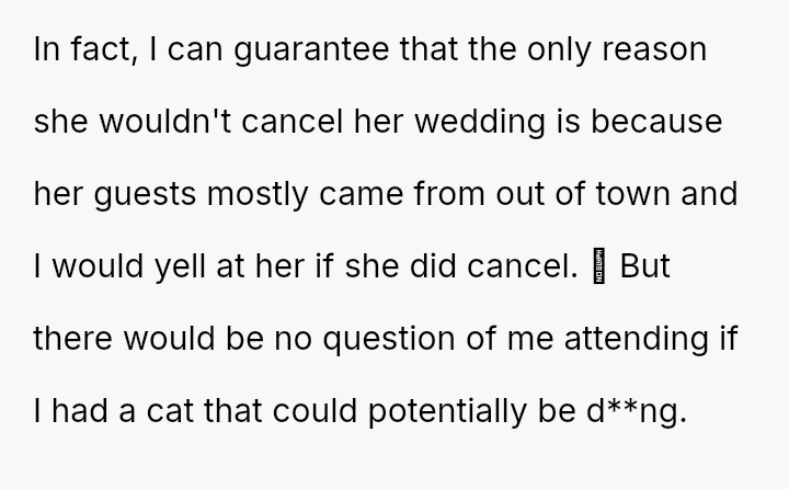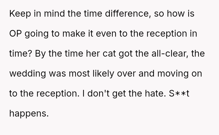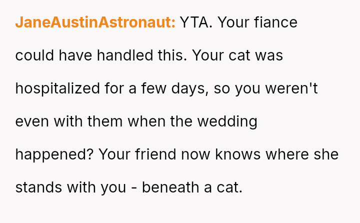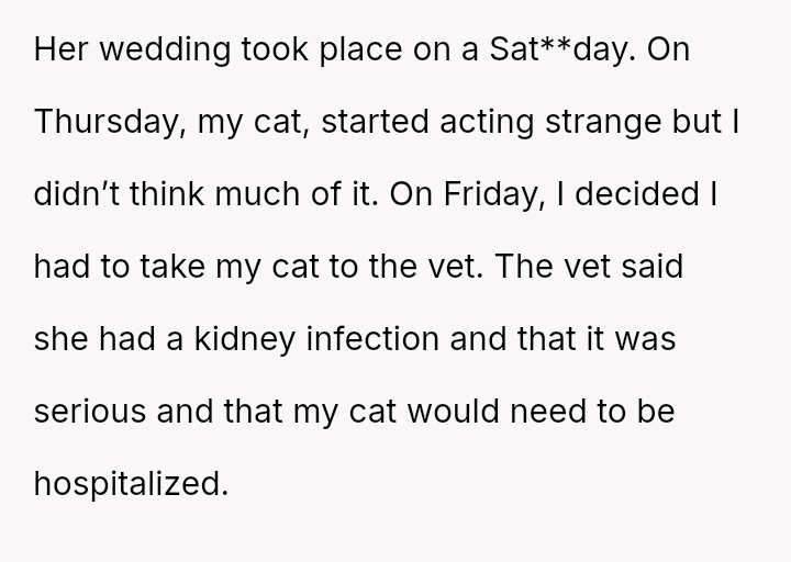 Given the unforeseen medical crisis of the cat versus the significant planning and emotional investment in the wedding, was the OP's choice to remain with her pet the appropriate action, or did her commitment as a bridesmaid necessitate prioritizing the wedding event, regardless of the personal emergency?
