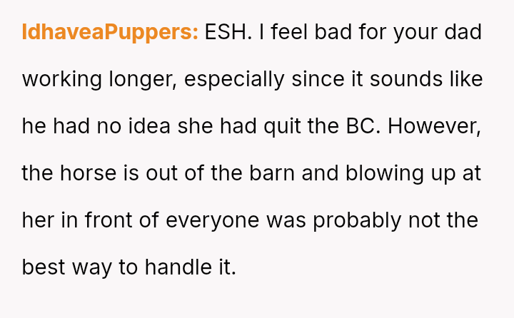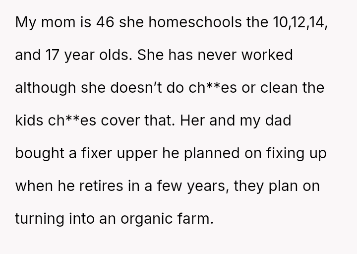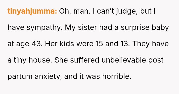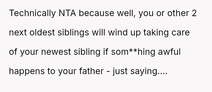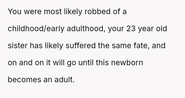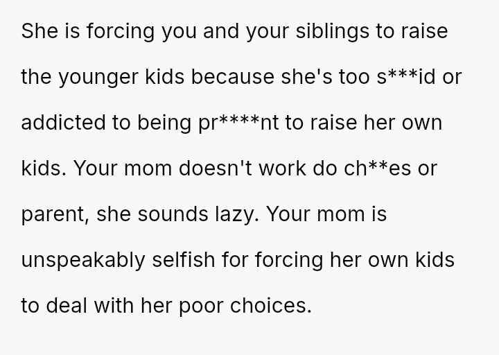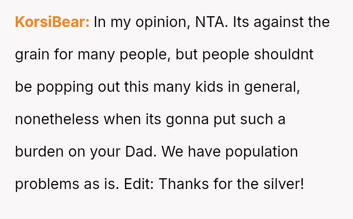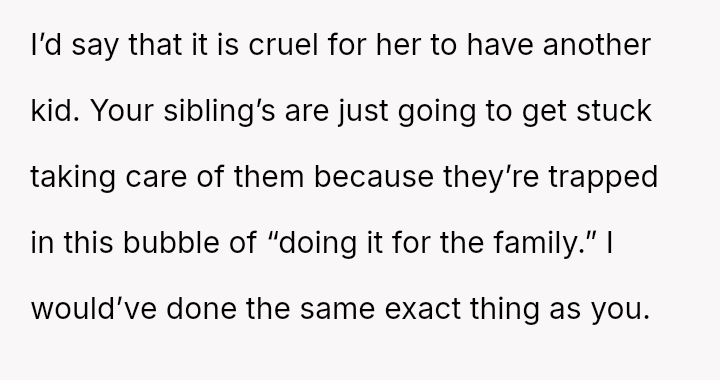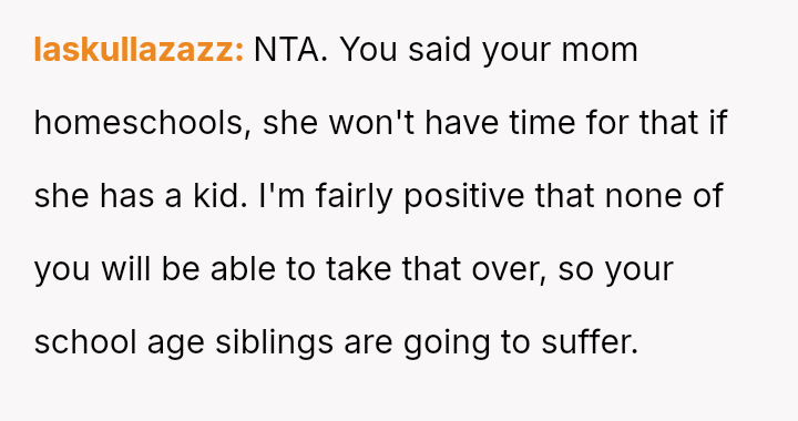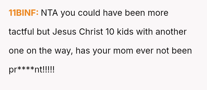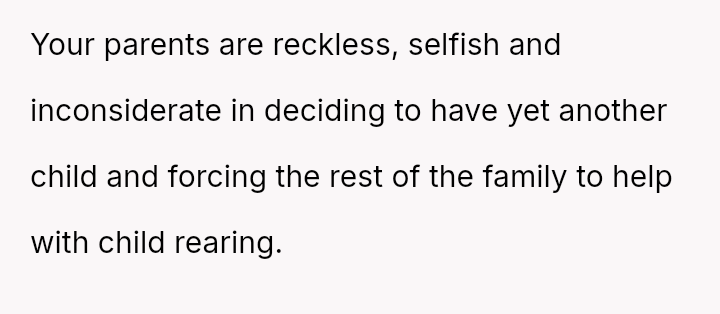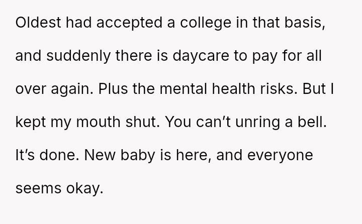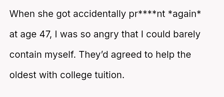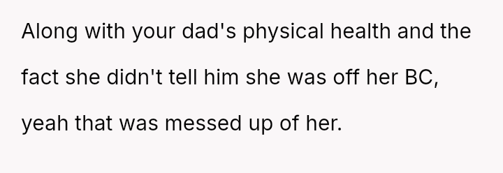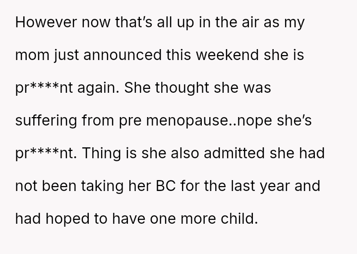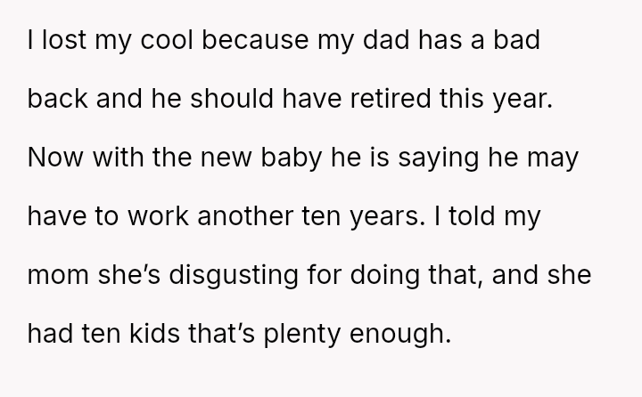 The original poster (OP) strongly a*serted their belief that their mother's decision to become pr****nt again, after neglecting birth control, was irresponsible given the family's existing situation and the father's health.