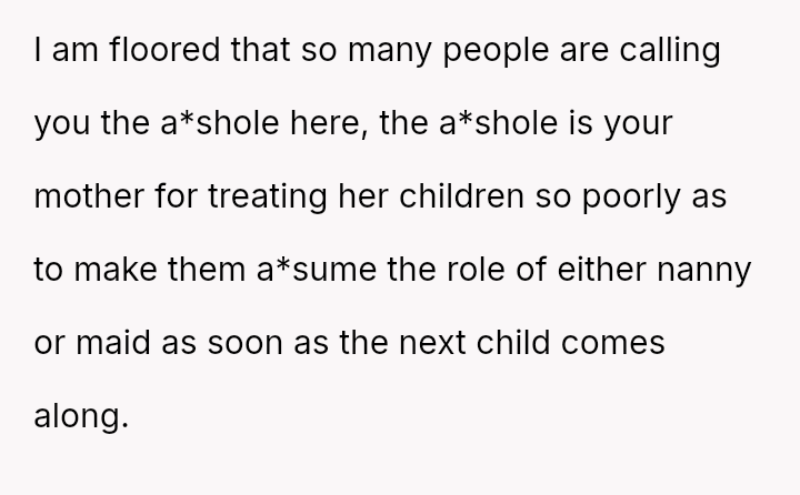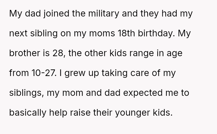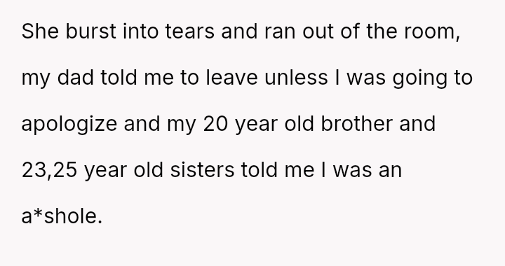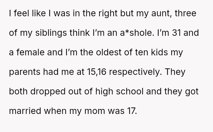 This firm stance immediately led to significant emotional distress for the mother and caused the OP to be alienated by their mother, father, and three siblings.