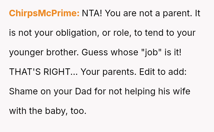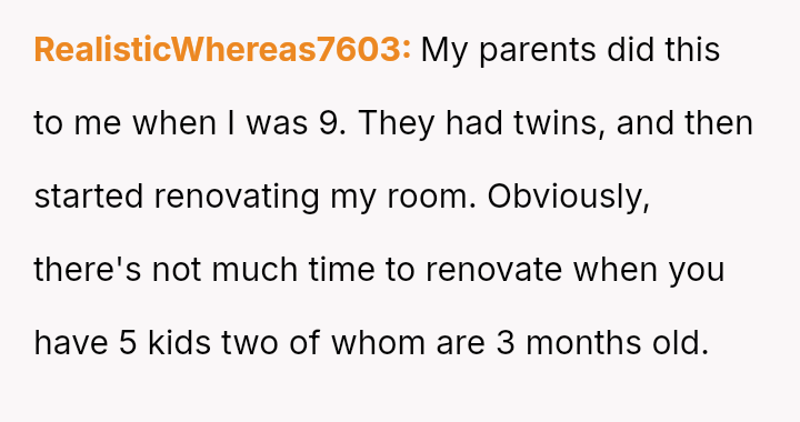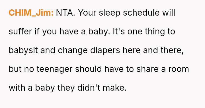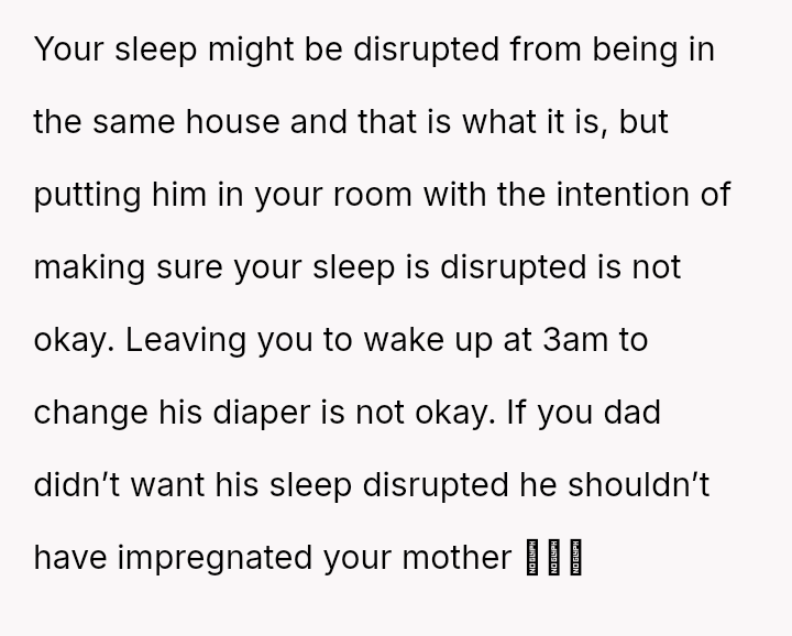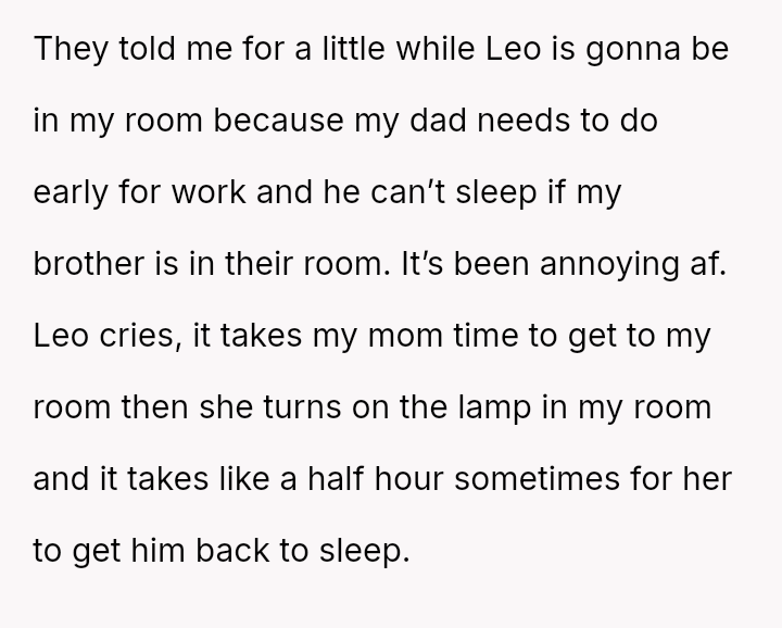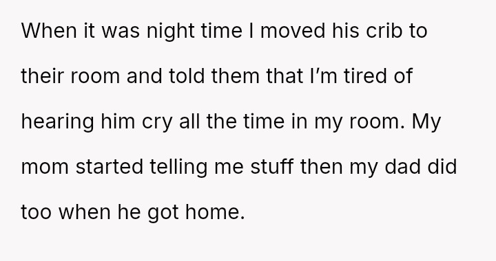 The original poster (OP) experienced significant distress due to the disruption caused by the infant brother staying in his room and took decisive, albeit unilateral, action by moving the crib to the parents' room.