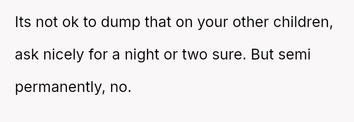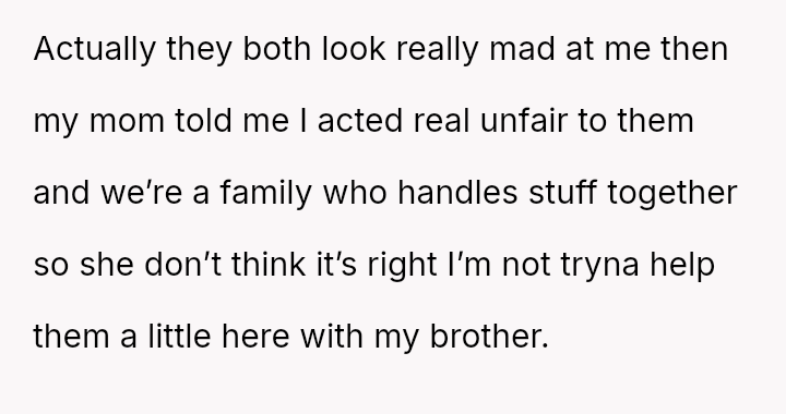 The debate centers on the boundary between personal needs and shared family responsibility during a temporary crisis.